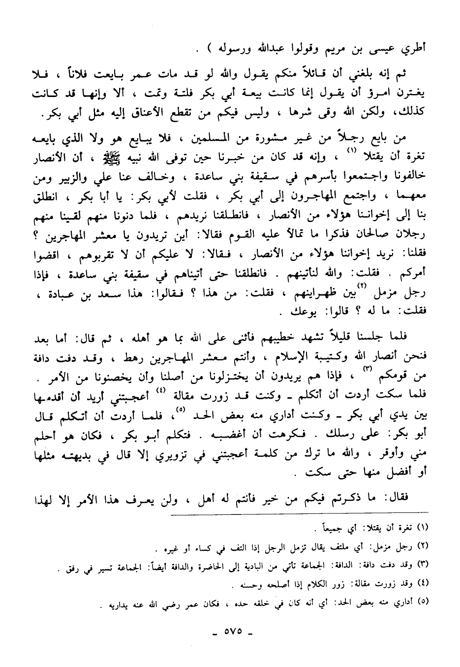 من بايع رجلًا من غير مشورة من المسلمين، فلا يبايع هو ولا الذي بايعه تغرة أن يقتلا (¬1)، وإنه قد كان من خبرنا حين توفي الله نبيه - صلى الله عليه وسلم -، أن الأنصار خالفونا واجتمعوا بأسرهم في سقيفة بني ساعدة، وخالف عنا علي والزبير ومن معهما، واجتمع المهاجرون إلى أبي بكر، فقلت لأبي بكر: يا أبا بكر، انطلق بنا إلى إخواننا هؤلاء من الأنصار، فانطلقنا نريدهم، فلما دنونا منهم لقينا منهم رجلان صالحان فذكرا ما تمالأ عليه القوم فقالا: أين تريدون يا معشر المهاجرين؟ فقلنا: نريد إخواننا هؤلاء من الأنصار، فقالا: لا عليكم أن لا تقربوهم، اقضوا أمركم. فقلت: والله لنأتينهم. فانطلقنا حتى أتيناهم في سقيفة بني ساعدة، فإذا رجل مزمل (¬2) بين ظهراينهم، فقلت: من هذا؟ فقالوا: هذا سعد بن عبادة، فقلت: ما له؟ قالوا: يوعك.