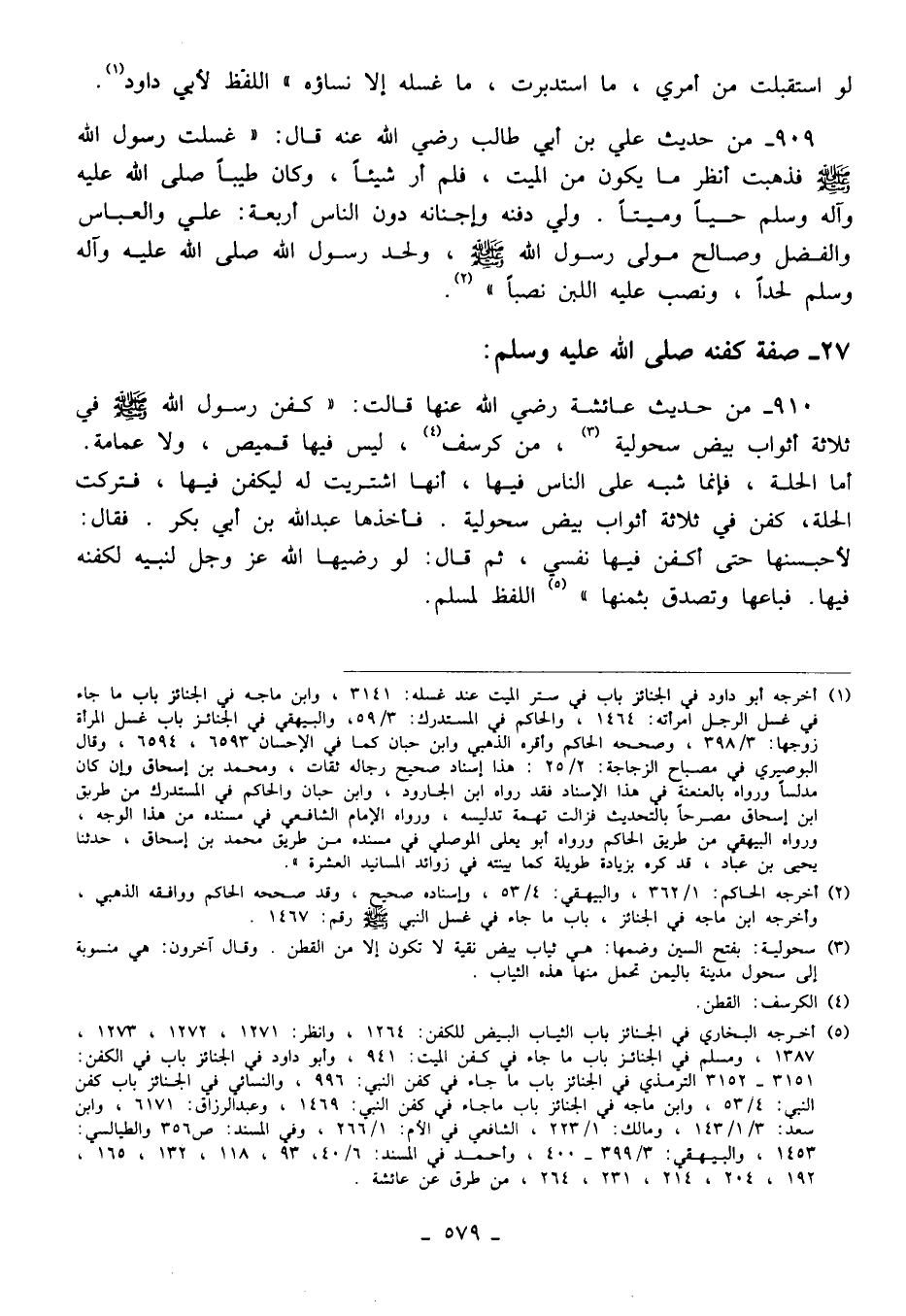 909 - من حديث علي بن أبي طالب رضي الله عنه قال: "غسلت رسول الله - صلى الله عليه وسلم - فذهبت أنظر ما يكون من الميت، فلم أر شيئًا، وكان طيبًا صلى الله عليه وآله وسلم حيًّا وميتًا. ولي دفنه وإجنانه دون الناس أربعة: علي والعباس والفضل وصالح مولى رسول الله - صلى الله عليه وسلم -، ولحد رسول الله صلى الله عليه وآله وسلم لحدًا، ونصب عليه اللبن نصبًا" (¬2).
