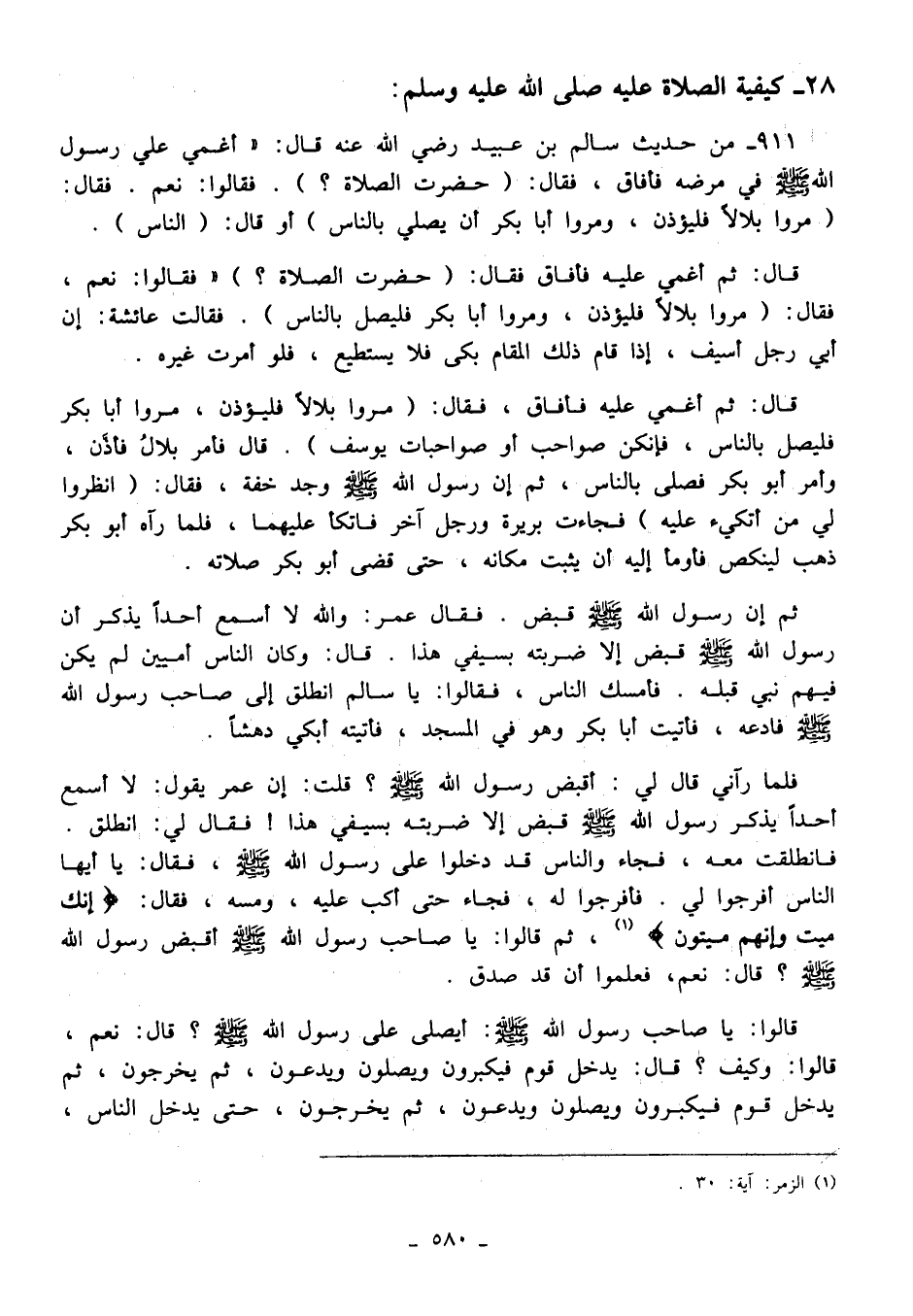 911 - من حديث سالم بن عبيد رضي الله عنه قال: "أغمي علي رسول الله - صلى الله عليه وسلم - في مرضه فأفاق، فقال: "حضرت الصلاة؟ ". فقالوا: نعم. فقال: "مروا بلالًا فليؤذن، ومروا أبا بكر أن يصلي بالناس" أو قال: "الناس".