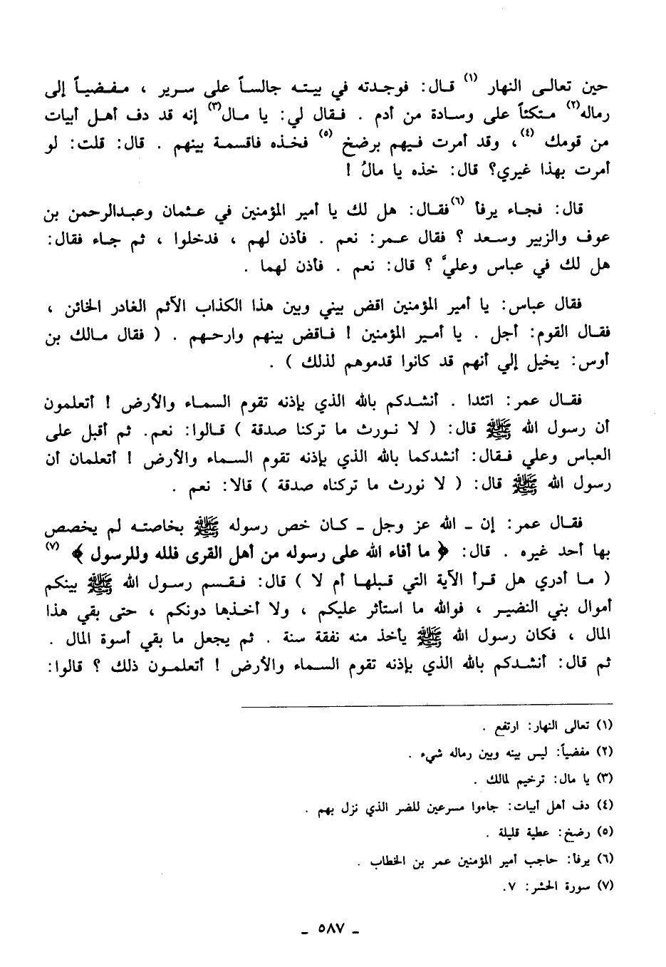 فقال عمر: اتئدا. أنشدكم بالله الذي بإذنه تقوم السماء والأرض! أتعلمون أن رسول الله - صلى الله عليه وسلم - قال: "لا نورث ما تركنا صدقة" قالوا: نعم. ثم أقبل على العباس وعلي فقال: أنشدكما بالله الذي بإذنه تقوم السماء والأرض! أتعلمان أن رسول الله - صلى الله عليه وسلم - قال: "لا نورث ما تركناه صدقة" قالا: نعم.