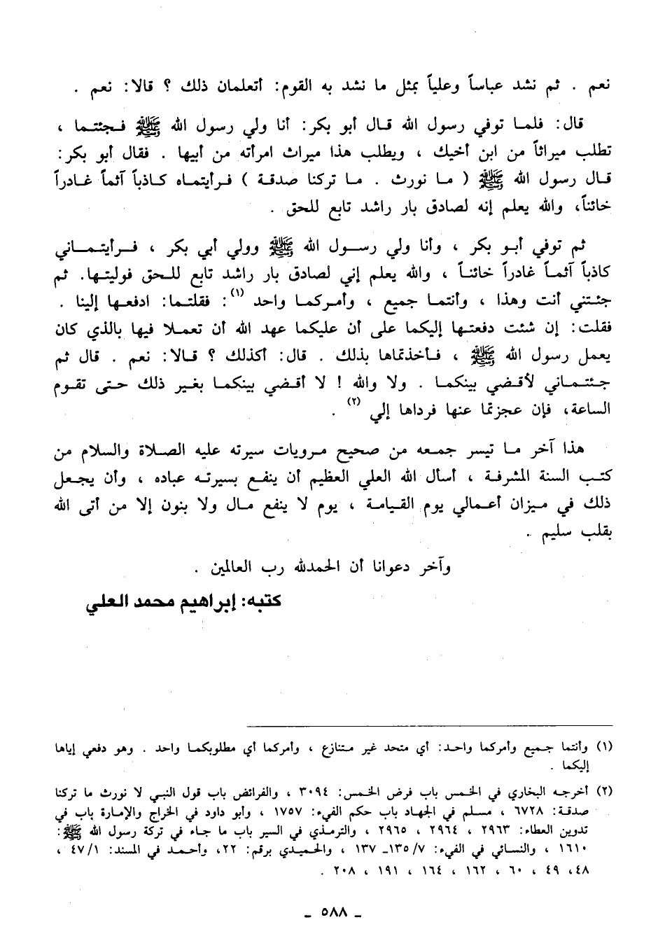 (¬2) أخرجه البخاري في الخمس باب فرض الخمس: 3094، والفرائض باب قول النبي لا نورث ما تركنا صدقة: 6728، مسلم في الجهاد باب حكم الفيء: 1757، وأبو داود في الخراج والإمارة باب في تدوين العطاء: 2963، 2964، 2965، والترمذي في السير باب ما جاء في تركة رسول الله - صلى الله عليه وسلم -: 1610، والنسائي في الفيء: 7/ 135 - 137، والحميدي برقم: 22, وأحمد في المسند: 1/ 47، 48، 49، 60، 162، 164، 191، 208.