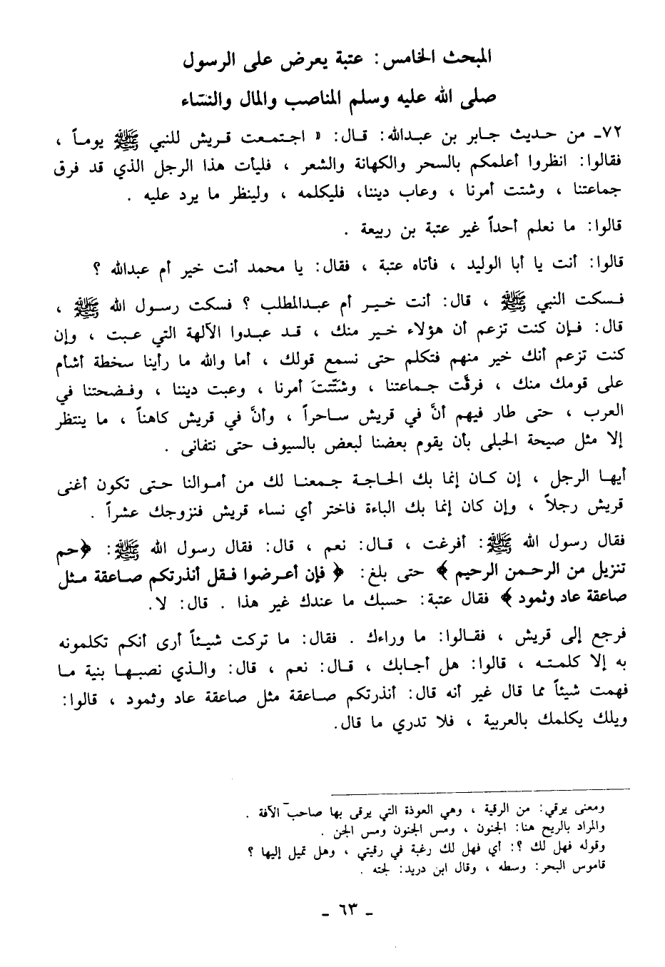 المبحث الخامس: عتبة يعرض على الرسول صلى الله عليه وسلم المناصب والمال والنساء