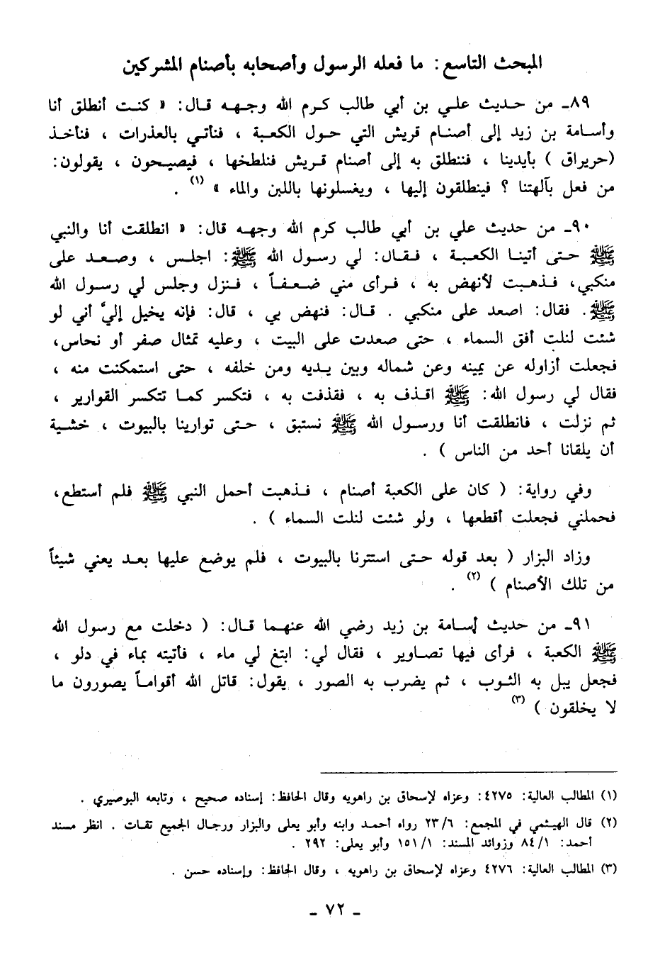 90 - من حديث علي بن أبي طالب كرم الله وجهه قال: "انطلقت أنا والنبي - صلى الله عليه وسلم - حتى أتينا الكعبة، فقال: لي رسول الله - صلى الله عليه وسلم -: اجلس، وصعد على منكبي، فذهبت لأنهض به، فرأى مني ضعفًا، فنزل وجلس لي رسول الله - صلى الله عليه وسلم - فقال: اصعد على منكبي. قال: فنهض بي، قال: فإنه يخيل إليَّ أني لو شئت لنلت أفق السماء، حتى صعدت على البيت، وعليه تمثال صفر أو نحاس، فجعلت أزاوله عن يمينه وعن شماله وبين يديه ومن خلفه، حتى استمكنت منه، فقال لي رسول الله: - صلى الله عليه وسلم - اقذف به، فقذفت به، فتكسر كما تتكسر القوارير، ثم نزلت، فانطلقت أنا ورسول الله - صلى الله عليه وسلم - نستبق، حتى توارينا بالبيوت، خشية أن يلقانا أحد من الناس).