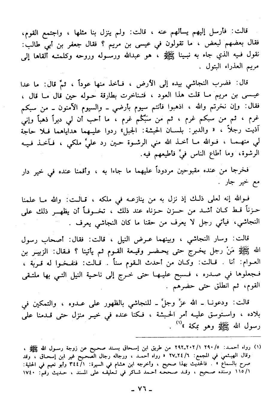 قالت: فأرسل إليهم يسألهم عنه، قالت: ولم ينزل بنا مثلها، واجتمع القوم، فقال بعضهم لبعض، ما تقولون في عيسى بن مريم؟ فقال جعفر بن أبي طالب: نقول فيه الذي جاء به نبينا - صلى الله عليه وسلم -، هو عبد الله ورسوله وروحه وكلمته ألقاها إلى مريم العذراء البتول.