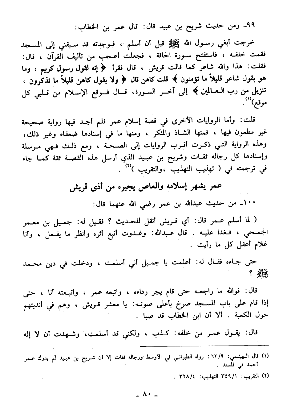 قلت: وأما الروايات الأخرى في قصة إسلام عمر فلم أجد فيها رواية صحيحة غير مطعون فيها، فمنها الشاذ والمنكر، ومنها ما في إسنادها ضعفاء وغير ذلك، وهذه الرواية التي ذكرت أقرب الروايات إلى الصحة، ومع ذلك فهي مرسلة وإسنادها كل رجاله ثقات وشريح بن عبيد الذي أرسل هذه القصة ثقة كما جاء في ترجمته في (تهذيب التهذيب، والتقريب) (¬2).