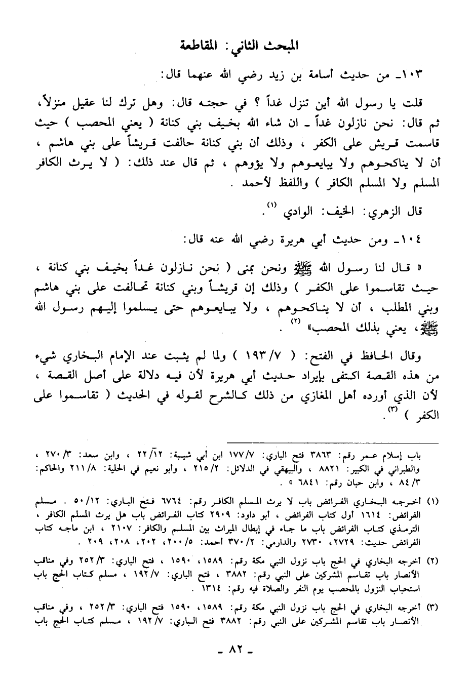 (¬2) أخرجه البخاري في الحج باب نزول النبي مكة رقم: 1589،1590، فتح الباري: 3/ 252 وفي مناقب الأنصار باب تقاسم المشركين على النبي رقم:3882، فتح الباري: 7/ 192، مسلم كتاب الحج باب استحباب النزول بالمحصب يوم النفر والصلاة فيه رقم: 1314.