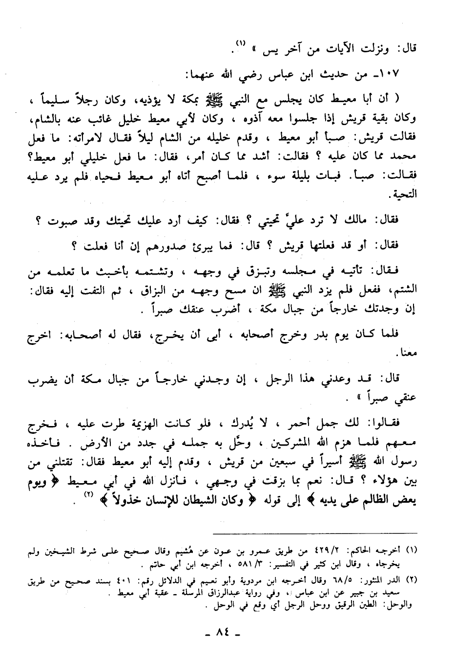 (¬2) الدر المنثور: 5/ 68 وقال أخرجه ابن مردويه وأبو نعيم في الدلائل رقم: 401 بسند صحيح من طريق سعيد بن جبير عن ابن عباس، وفي رواية عبد الرزاق المرسلة- عقبة أبي معيط.