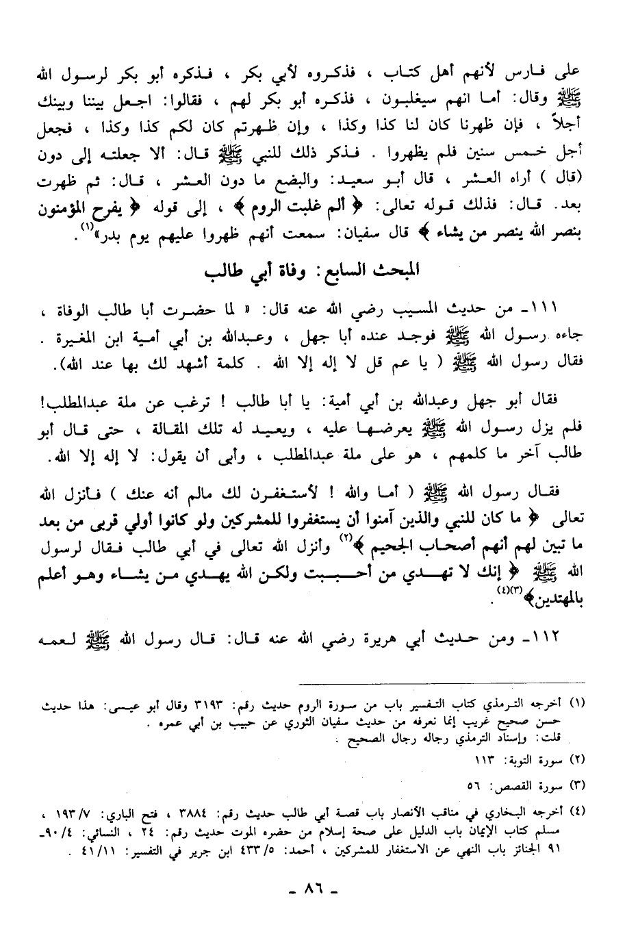 (¬4) أخرجه البخاري في مناقب الأنصار باب قصة أبي طالب حديث رقم: 3884، فتح الباري:7/ 193، مسلم كتاب الإيمان باب الدليل على صحة إسلام من حضره الموت حديث رقم: 24، النسائي: 4/ 90 - 91 الجنائز باب النهي عن الاستغفار للمشركين، أحمد:5/ 433 ابن جرير في التفسير: 11/ 41.