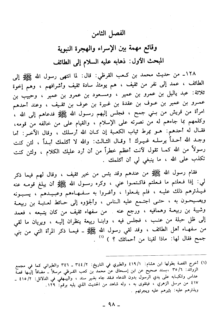 (¬1) أخرج القصة بطولها ابن هشام: 1/ 419 والطبري في التاريخ: 2/ 344 - 346 والطبراني كما في مجمع الزوائد: 6/ 35، بسند صحيح عن ابن إسحاق عن محمَّد بن كعب القرظي مرسلًا- مضافًا إليها قصة عداس وانكبابه على يدي الرسول بدون الدعاء فقد جاء بغير سند، والبيهقي في الدلائل: 2/ 415 - 417 من مرسل الزهري، فيتقوى به، وله شاهد من الحديث الذي يليه برقم: 129.