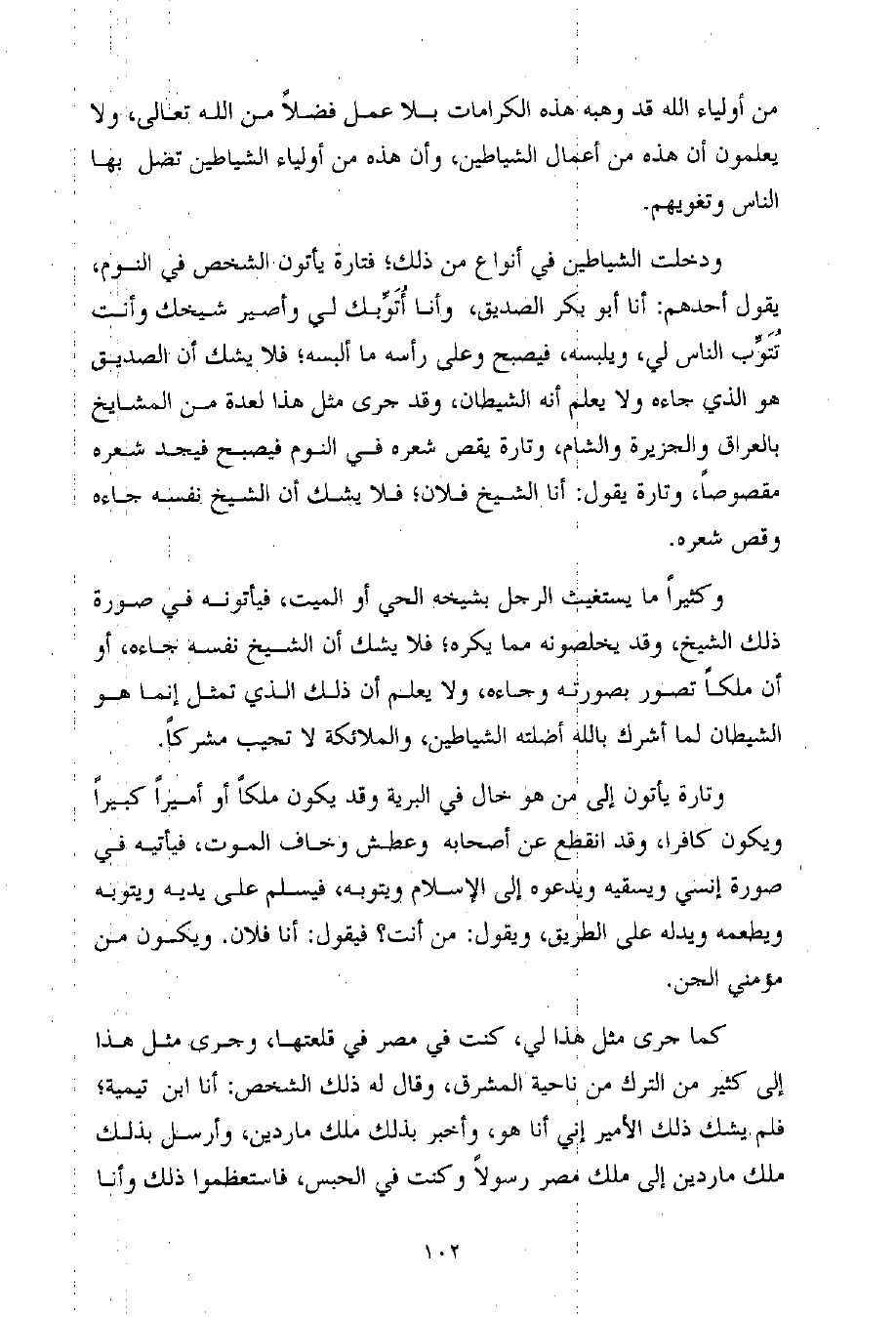 ودخلت الشياطين في أنواع من ذلك؛ فتارة يأتون الشخص في النوم، يقول أحدهم: أنا أبو بكر الصديق، وأنا أُتَوِّبك لي وأصير شيخك وأنت تُتَوِّب الناس لي، ويلبسه، فيصبح وعلى رأسه ما ألبسه؛ فلا يشك أن الصديق هو الذي جاءه ولا يعلم أنه الشيطان، وقد جرى مثل هذا لعدة من المشايخ بالعراق والجزيرة والشام، وتارة يقص شعره في النوم فيصبح فيجد شعره مقصوصاً، وتارة يقول: أنا الشيخ فلان؛ فلا يشك أن الشيخ نفسه جاءه وقص شعره.