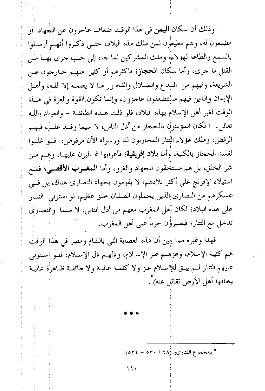 وذلك أن سكان اليمن في هذا الوقت ضعاف عاجزون عن الجهاد أو مضيعون له، وهم مطيعون لمن ملك هذه البلاد، حتى ذكروا أنهم أرسلوا بالسمع والطاعة لهؤلاء، وملك المشركين لما جاء إلى حلب جرى بها من القتل ما جرى، وأما سكان الحجاز؛ فاكثرهم أو كثير منهم خارجون عن الشريعة، وفيهم من البدع والضلال والفجور ما لا يعلمه إلا الله، وأهل الإيمان والدين فيهم مستضعفون عاجزون، وإنما تكون القوة والعزة في هذا الوقت لغير أهل الإسلام بهذه البلاد، فلو ذلت هذه الطائفة - والعياذ بالله تعالى -؛ لكان المؤمنون بالحجاز من أذل الناس، لا سيما وقد غلب فيهم الرفض، وملك هؤلاء التتار المحاربون لله ورسوله الآن مرفوض، فلو غلبوا لفسد الحجاز بالكلية، وأما بلاد إفريقية؛ فأعرابها غالبون عليها، وهم من شر الخلق، بل هم مستحقون للجهاد والغزو، وأما المغرب الأقصى؛ فمع استيلاء الإفرنج على أكثر بلادهم، لا يقومون بجهاد النصارى هناك، بل في عسكرهم من النصارى الذين يحملون الصلبان خلق عظيم، لو استولى التتار على هذه البلاد؛ لكان أهل المغرب معهم من أذل الناس، لا سيما والنصارى تدخل مع التتار؛ فيصيرون حزباً على أهل المغرب.