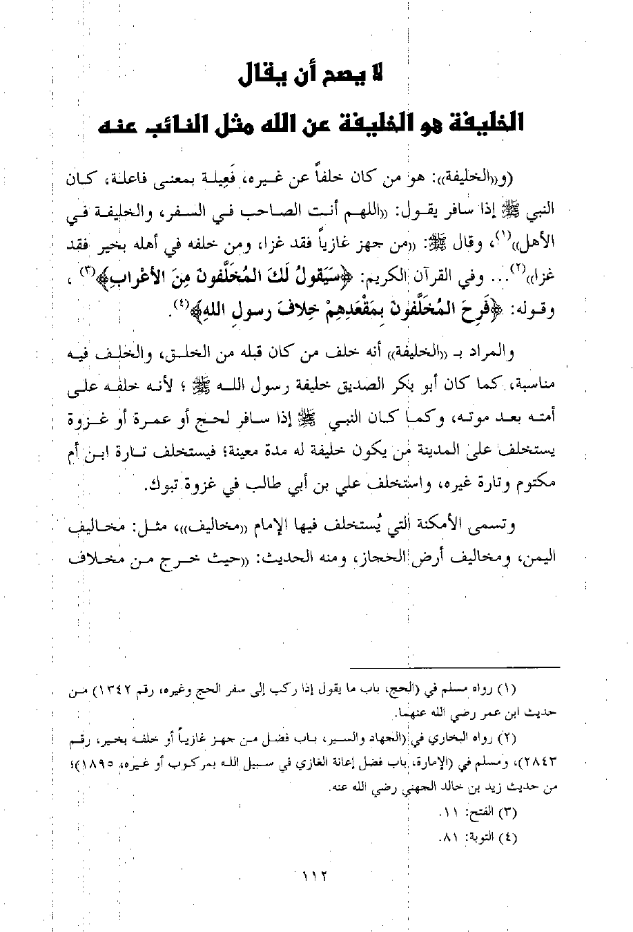 (و ((الخليفة)) : هو من كان خلفاً عن غيره، فَعِيلة بمعنى فاعلة، كان النبي - صلى الله عليه وسلم - إذا سافر يقول: ((اللهم أنت الصاحب في السفر، والخليفة في الأهل)) (¬1) ، وقال - صلى الله عليه وسلم -: ((من جهز غازياً فقد غزا، ومن خلفه في أهله بخير فقد غزا)) (¬2) ... وفي القرآن الكريم: {سَيَقولُ لَكَ المُخَلَّفونَ مِنَ الأعْرابِ} (¬3) ، وقوله: {فَرِحَ المُخَلَّفونَ بِمَقْعَدِهِمْ خِلافَ رسولِ اللهِ} (¬4) .