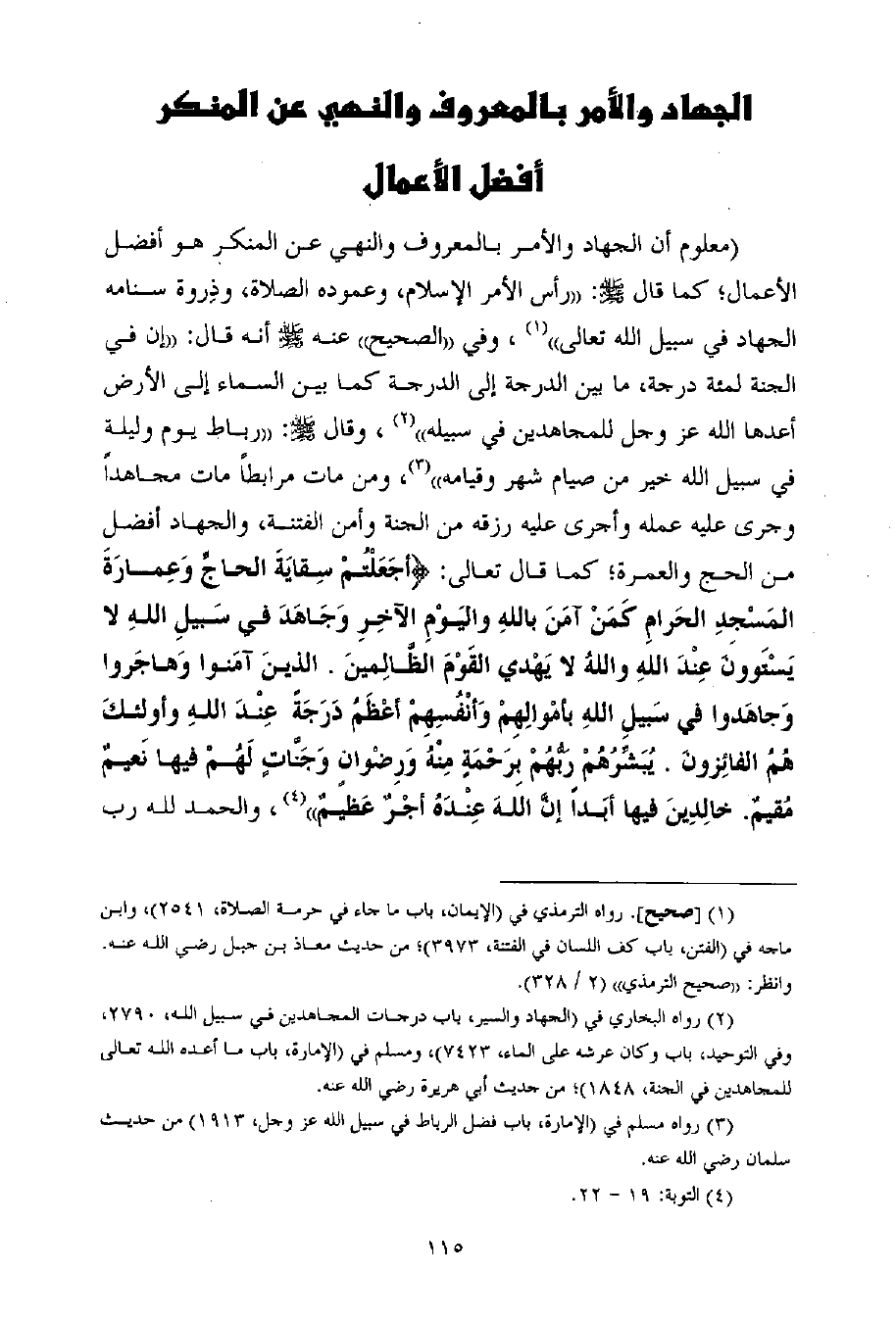 (معلوم أن الجهاد والأمر بالمعروف والنهي عن المنكر هو أفضل الأعمال؛ كما قال - صلى الله عليه وسلم -: ((رأس الأمر الإسلام، وعموده الصلاة، وذِروة سنامه الجهاد في سبيل الله تعالى)) (¬1) ، وفي ((الصحيح)) عنه - صلى الله عليه وسلم - أنه قال: ((إن في الجنة لمئة درجة، ما بين الدرجة إلى الدرجة كما بين السماء إلى الأرض أعدها الله عز وجل للمجاهدين في سبيله)) (¬2) ، وقال - صلى الله عليه وسلم -: ((رباط يوم وليلة في سبيل الله خير من صيام شهر وقيامه)) (¬3) ، ومن مات مرابطاً مات مجاهداً وجرى عليه عمله وأجرى عليه رزقه من الجنة وأمن الفتنة، والجهاد أفضل من الحج والعمرة؛ كما قال تعالى: {أجَعَلْتُمْ سِقايَةَ الحاجِّ وَعِمارَةَ المَسْجِدِ الحَرامِ كَمَنْ آمَنَ باللهِ واليَوْمِ الآخِرِ وَجَاهَدَ في سَبيلِ اللهِ لا يَسْتَوونَ عِنْدَ اللهِ واللهُ لا يَهْدي القَوْمَ الظَّالِمينَ. الذينَ آمَنوا وَهاجَروا وَجاهَدوا في سَبيلِ اللهِ بأمْوالِهِمْ وَأنْفُسِهِمْ أعْظَمُ دَرَجَةً عِنْدَ اللهِ وأولئكَ هُمُ الفائِزونَ. يُبَشِّرُهُمْ رَبُّهُمْ بِرَحْمَةٍ مِنْهُ وَرِضْوانٍ وَجَنَّاتٍ لَهُمْ فيها نَعيمٌ مُقيمٌ. خالِدِينَ فيها أبَداً إنَّ اللهَ عِنْدَهُ أجْرٌ عَظيمٌ)) (¬4) ،
