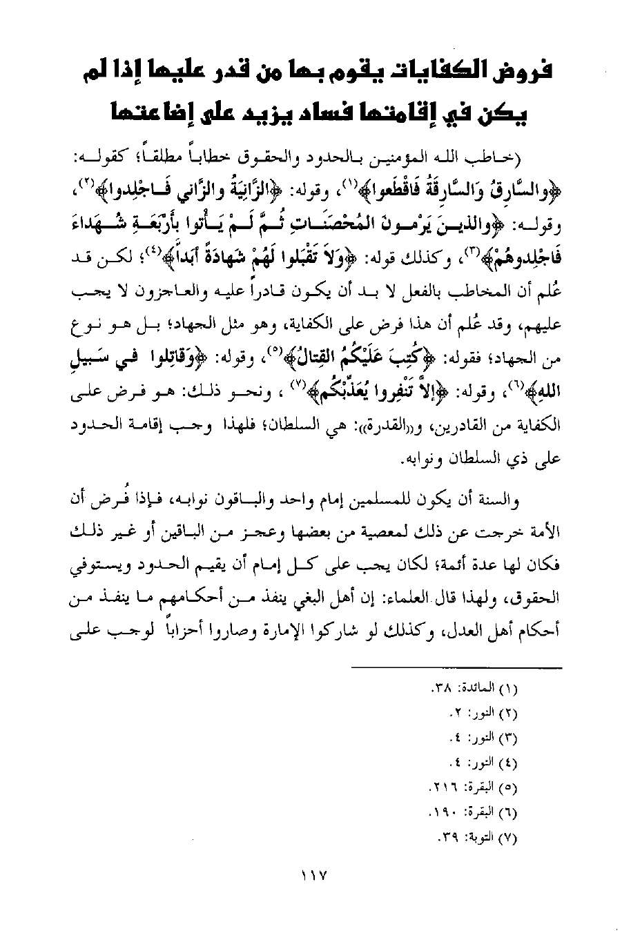 (خاطب الله المؤمنين بالحدود والحقوق خطاباً مطلقاً؛ كقوله: {والسَّارِقُ وَالسَّارِقَةُ فَاقْطَعوا} (¬1) ، وقوله: {الزَّانِيَةُ والزَّاني فَاجْلِدوا} (¬2) ، وقوله: {والذينَ يَرْمونَ المُحْصَنَاتِ ثُمَّ لَمْ يَأْتوا بِأَرْبَعَةِ شُهَداءَ فَاجْلِدوهُمْ} (¬3) ، وكذلك قوله: {وَلاَ تَقْبَلوا لَهُمْ شَهادَةً أبَداً} (¬4) ؛ لكن قد عُلم أن المخاطب بالفعل لا بد أن يكون قادراً عليه والعاجزون لا يجب عليهم، وقد عُلم أن هذا فرض على الكفاية، وهو مثل الجهاد؛ بل هو نوع من الجهاد؛ فقوله: {كُتِبَ عَلَيْكُمُ القِتالُ} (¬5) ، وقوله: {وَقاتِلوا في سَبيلِ اللهِ} (¬6) ، وقوله: {إلاَّ تَنْفِروا يُعَذِّبْكُم} (¬7) ، ونحو ذلك: هو فرض على الكفاية من القادرين، و ((القدرة)) : هي السلطان؛ فلهذا وجب إقامة الحدود على ذي السلطان ونوابه.