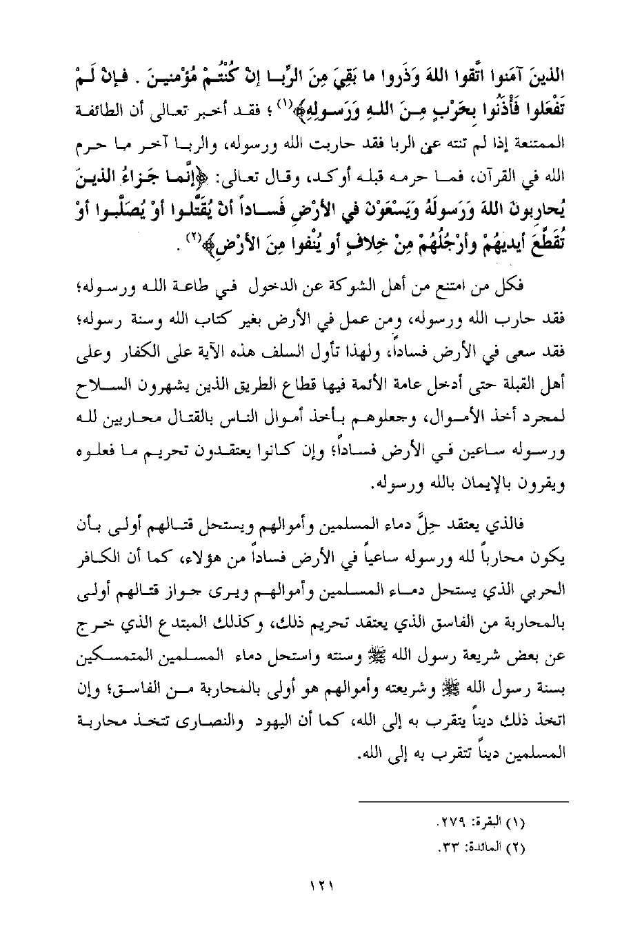 فالذي يعتقد حِلَّ دماء المسلمين وأموالهم ويستحل قتالهم أولى بأن يكون محارباً لله ورسوله ساعياً في الأرض فساداً من هؤلاء، كما أن الكافر الحربي الذي يستحل دماء المسلمين وأموالهم ويرى جواز قتالهم أولى بالمحاربة من الفاسق الذي يعتقد تحريم ذلك، وكذلك المبتدع الذي خرج عن بعض شريعة رسول الله - صلى الله عليه وسلم - وسنته واستحل دماء المسلمين المتمسكين بسنة رسول الله - صلى الله عليه وسلم - وشريعته وأموالهم هو أولى بالمحاربة من الفاسق؛ وإن اتخذ ذلك ديناً يتقرب به إلى الله، كما أن اليهود والنصارى تتخذ محاربة المسلمين ديناً تتقرب به إلى الله.