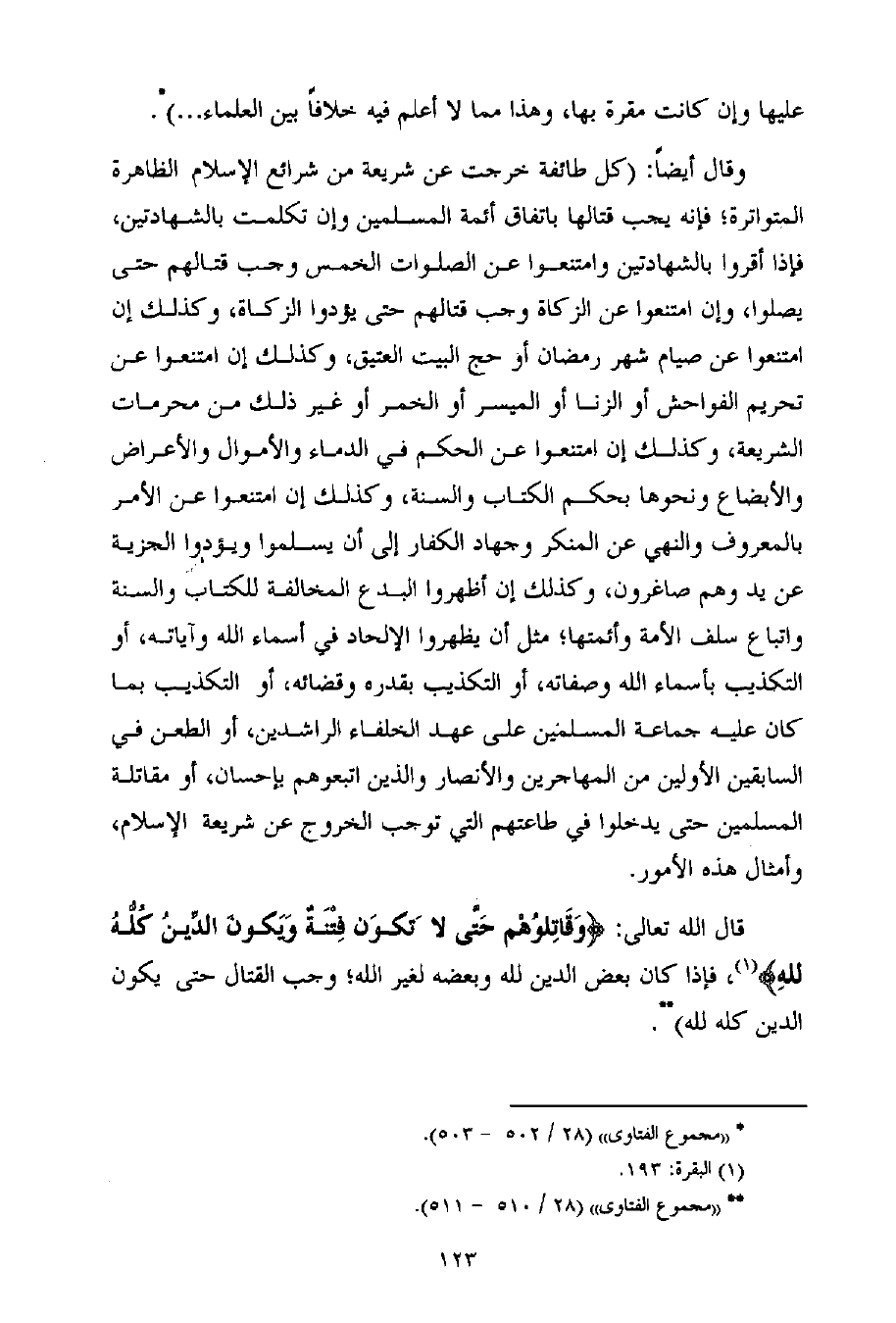 وقال أيضاً: (كل طائفة خرجت عن شريعة من شرائع الإسلام الظاهرة المتواترة؛ فإنه يجب قتالها باتفاق أئمة المسلمين وإن تكلمت بالشهادتين، فإذا أقروا بالشهادتين وامتنعوا عن الصلوات الخمس وجب قتالهم حتى يصلوا، وإن امتنعوا عن الزكاة وجب قتالهم حتى يؤدوا الزكاة، وكذلك إن امتنعوا عن صيام شهر رمضان أو حج البيت العتيق، وكذلك إن امتنعوا عن تحريم الفواحش أو الزنا أو الميسر أو الخمر أو غير ذلك من محرمات الشريعة، وكذلك إن امتنعوا عن الحكم في الدماء والأموال والأعراض والأبضاع ونحوها بحكم الكتاب والسنة، وكذلك إن امتنعوا عن الأمر بالمعروف والنهي عن المنكر وجهاد الكفار إلى أن يسلموا ويؤدوا الجزية عن يد وهم صاغرون، وكذلك إن أظهروا البدع المخالفة للكتاب والسنة واتباع سلف الأمة وأئمتها؛ مثل أن يظهروا الإلحاد في أسماء الله وآياته، أو التكذيب بأسماء الله وصفاته، أو التكذيب بقدره وقضائه، أو التكذيب بما كان عليه جماعة المسلمين على عهد الخلفاء الراشدين، أو الطعن في السابقين الأولين من المهاجرين والأنصار والذين اتبعوهم بإحسان، أو مقاتلة المسلمين حتى يدخلوا في طاعتهم التي توجب الخروج عن شريعة الإسلام، وأمثال هذه الأمور.