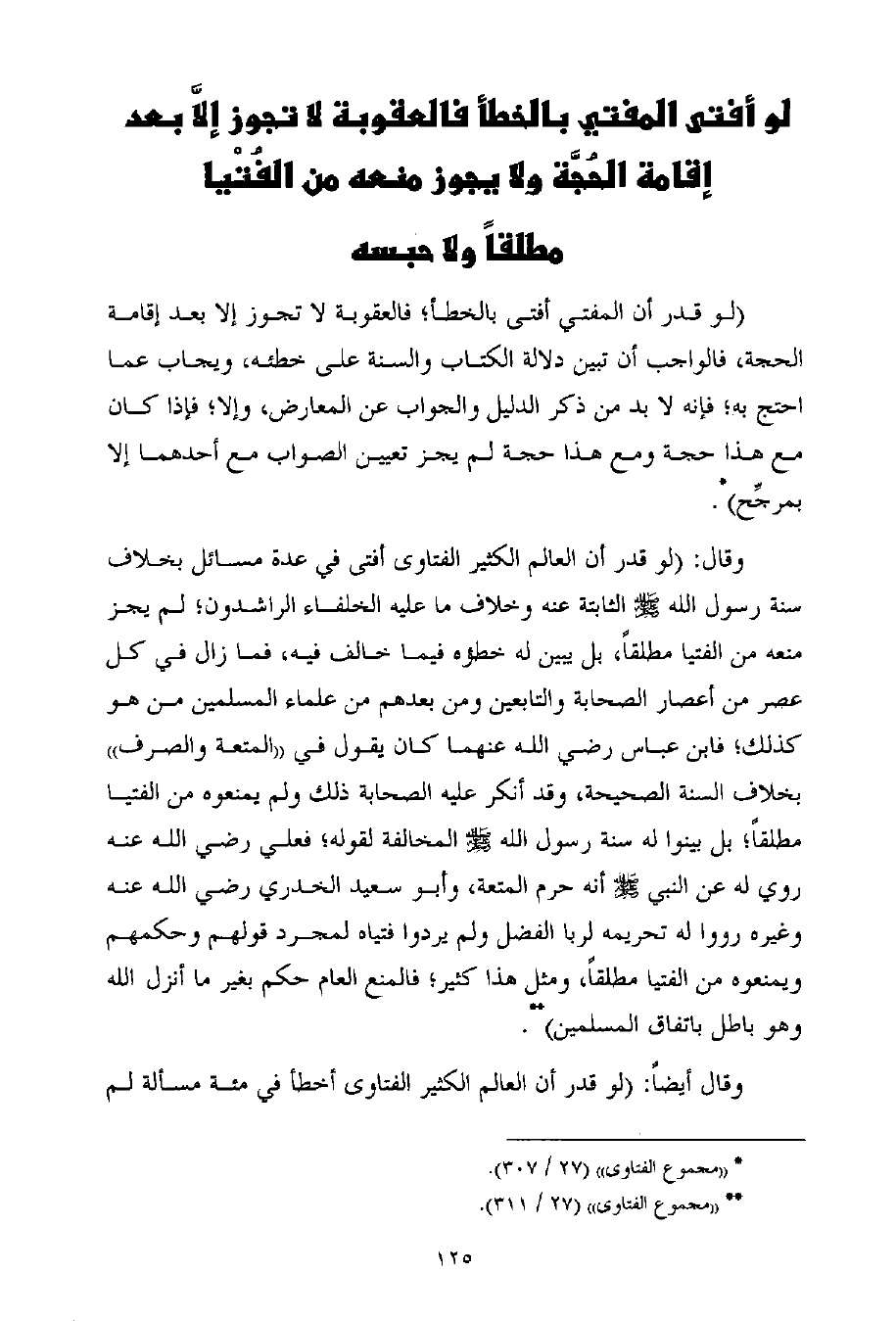 (لو قدر أن المفتي أفتى بالخطأ؛ فالعقوبة لا تجوز إلا بعد إقامة الحجة، فالواجب أن تبين دلالة الكتاب والسنة على خطئه، ويجاب عما احتج به؛ فإنه لا بد من ذكر الدليل والجواب عن المعارض، وإلا؛ فإذا كان مع هذا حجة ومع هذا حجة لم يجز تعيين الصواب مع أحدهما إلا بمرجِّح) (¬1) .