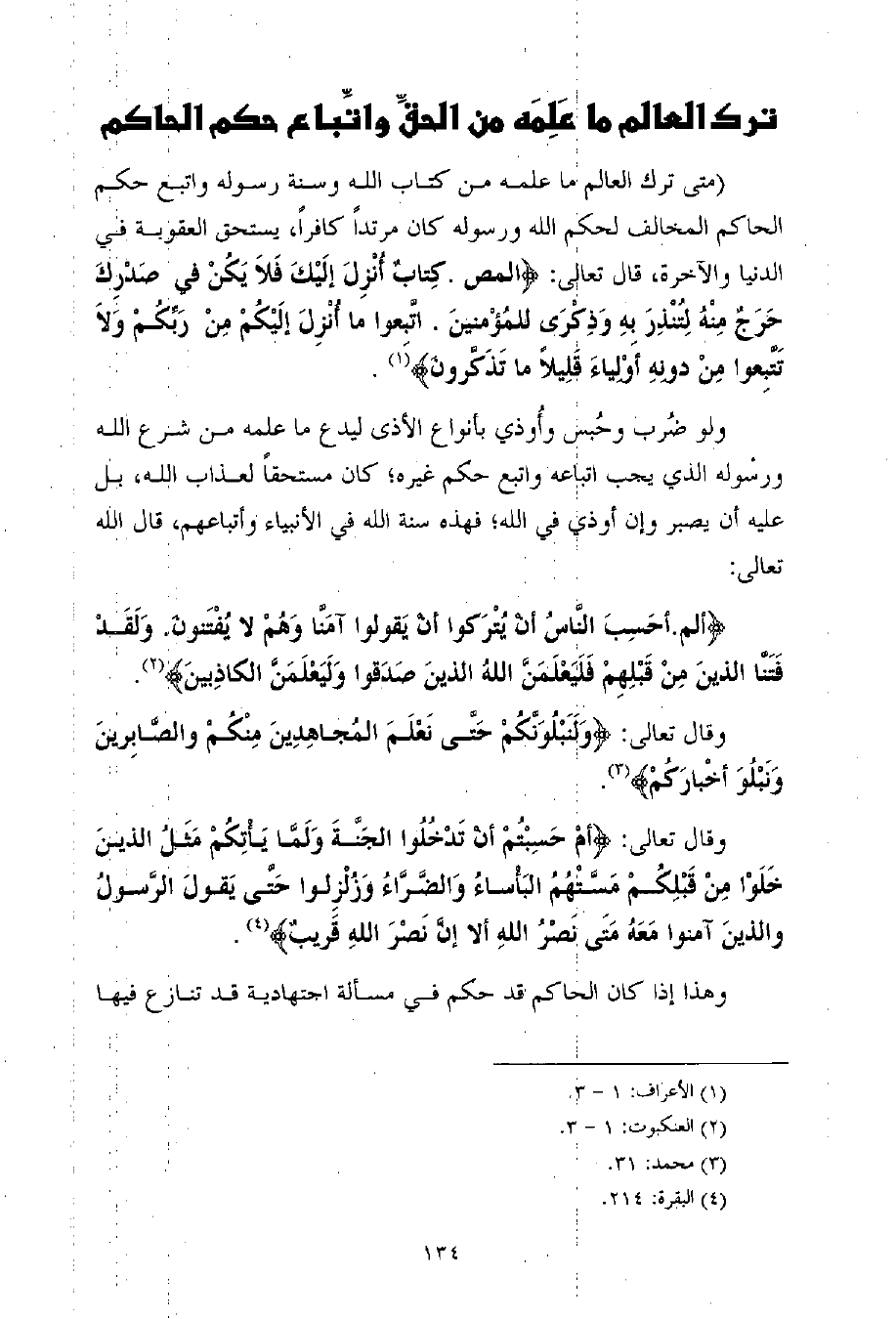 (متى ترك العالم ما علمه من كتاب الله وسنة رسوله واتبع حكم الحاكم المخالف لحكم الله ورسوله كان مرتداً كافراً، يستحق العقوبة في الدنيا والآخرة، قال تعالى: {المص.كِتابٌ أُنْزِلَ إلَيْكَ فَلاَ يَكُنْ في صَدْرِكَ حَرَجٌ مِنْهُ لِتُنْذِرَ بِهِ وَذِكْرَى للمُؤْمنينَ. اتَّبِعوا ما أُنْزِلَ إلَيْكُمْ مِنْ رَبِّكُمْ وَلاَ تَتَّبِعوا مِنْ دونِهِ أوْلِياءَ قَلِيلاً ما تَذَكَّرونَ} (¬1) .