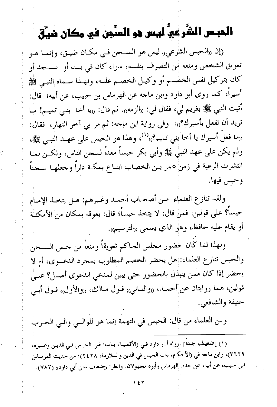 (إن ((الحبس الشرعي)) ليس هو السجن في مكان ضيق، وإنما هو تعويق الشخص ومنعه من التصرف بنفسه، سواء كان في بيت أو مسجد أو كان بتوكيل نفس الخصم أو وكيل الخصم عليه، ولهذا سماه النبي - صلى الله عليه وسلم - أسيراً، كما روى أبو داود وابن ماجه عن الهرماس بن حبيب، عن أبيه؛ قال: أتيت النبي - صلى الله عليه وسلم - بغريم لي، فقال لي: ((الزمه)) . ثم قال: ((يا أخا بني تميم! ما تريد أن تفعل بأسيرك؟)) ، وفي رواية ابن ماجه: ثم مر بي آخر النهار، فقال: ((ما فعل أسيرك يا أخا بني تميم؟)) (¬1) ، وهذا هو الحبس على عهد النبي - صلى الله عليه وسلم -، ولم يكن على عهد النبي - صلى الله عليه وسلم - وأبي بكر حبساً معداً لسجن الناس، ولكن لما انتشرت الرعية في زمن عمر بن الخطاب ابتاع بمكة داراً وجعلها سجناً وحبس فيها.