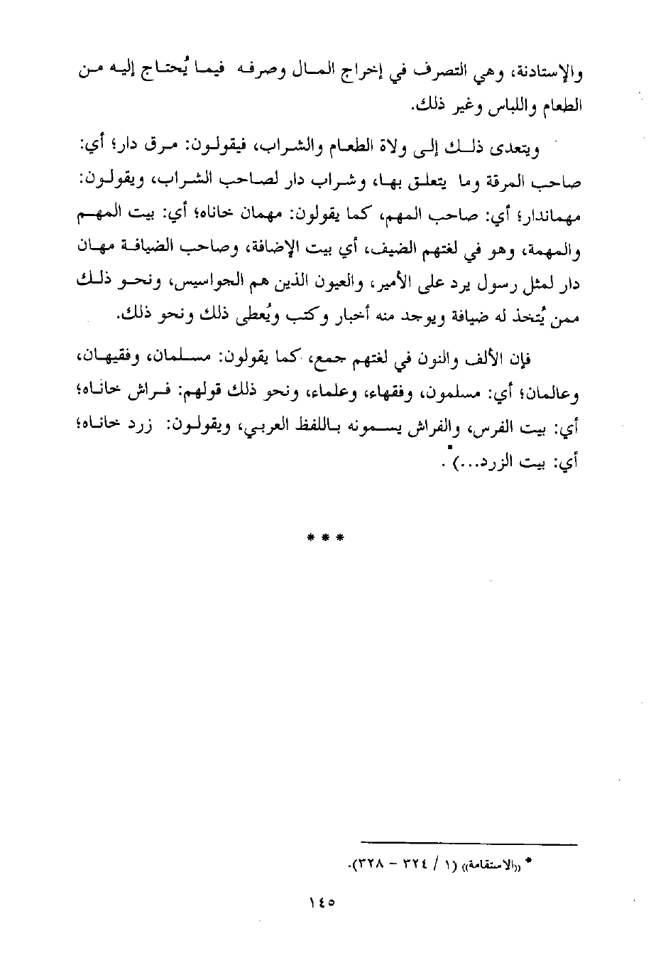 فإن الألف والنون في لغتهم جمع، كما يقولون: مسلمان، وفقيهان، وعالمان؛ أي: مسلمون، وفقهاء، وعلماء، ونحو ذلك قولهم: فراش خاناه؛ أي: بيت الفرس، والفراش يسمونه باللفظ العربي، ويقولون: زرد خاناه؛ أي: بيت الزرد ... ) (¬1) .
