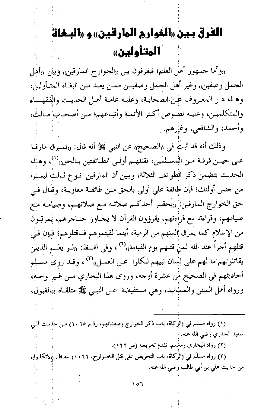((وأما جمهور أهل العلم؛ فيفرقون بين ((الخوارج المارقين)) وبين ((أهل الجمل وصفين)) وغير أهل الجمل وصفين ممن يعد من البغاة المتأولين، وهذا هو المعروف عن الصحابة، وعليه عامة أهل الحديث والفقهاء والمتكلمين، وعليه نصوص أكثر الأئمة وأتباعهم؛ من أصحاب مالك، وأحمد، والشافعي، وغيرهم.