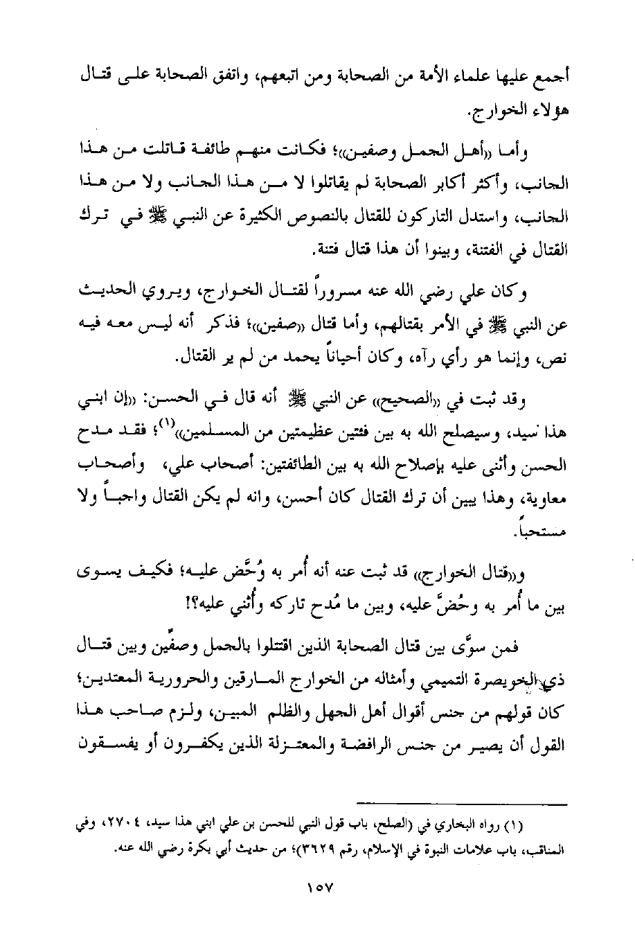 و ((قتال الخوارج)) قد ثبت عنه أنه أُمر به وُحَّض عليه؛ فكيف يسوى بين ما أُمر به وحُضَّ عليه، وبين ما مُدح تاركه وأُثني عليه؟!