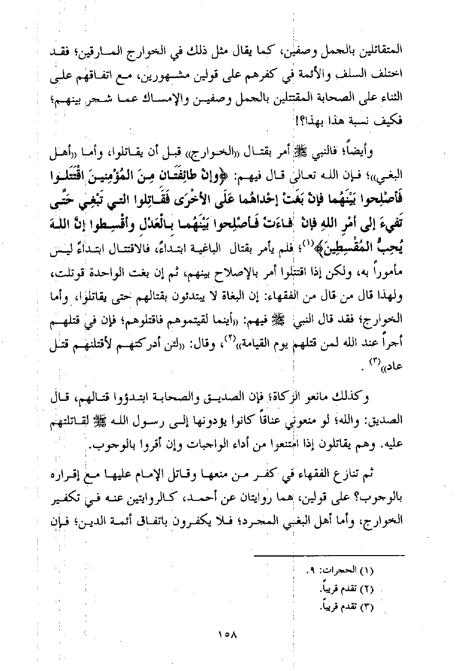 ثم تنازع الفقهاء في كفر من منعها وقاتل الإمام عليها مع إقراره بالوجوب؟ على قولين، هما روايتان عن أحمد، كالروايتين عنه في تكفير الخوارج، وأما أهل البغي المجرد؛ فلا يكفرون باتفاق أئمة الدين؛ فإن