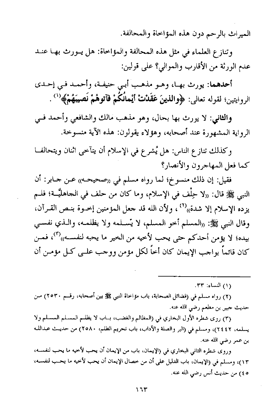 فقيل: إن ذلك منسوخ؛ لما رواه مسلم في ((صحيحه)) عن جابر: أن النبي - صلى الله عليه وسلم - قال: ((لا حِلْف في الإسلام، وما كان من حلف في الجاهليَّة؛ فلم يزده الإسلام إلا شدة)) (¬2) ، ولأن الله قد جعل المؤمنين إخوة بنص القرآن، وقال النبي - صلى الله عليه وسلم -: ((المسلم أخو المسلم، لا يسلمه ولا يظلمه، والذي نفسي بيده؛ لا يؤمن أحدكم حتى يحب لأخيه من الخير ما يحبه لنفسه)) (¬3) ، فمن كان قائماً بواجب الإيمان كان أخاً لكل مؤمن ووجب على كل مؤمن أن
