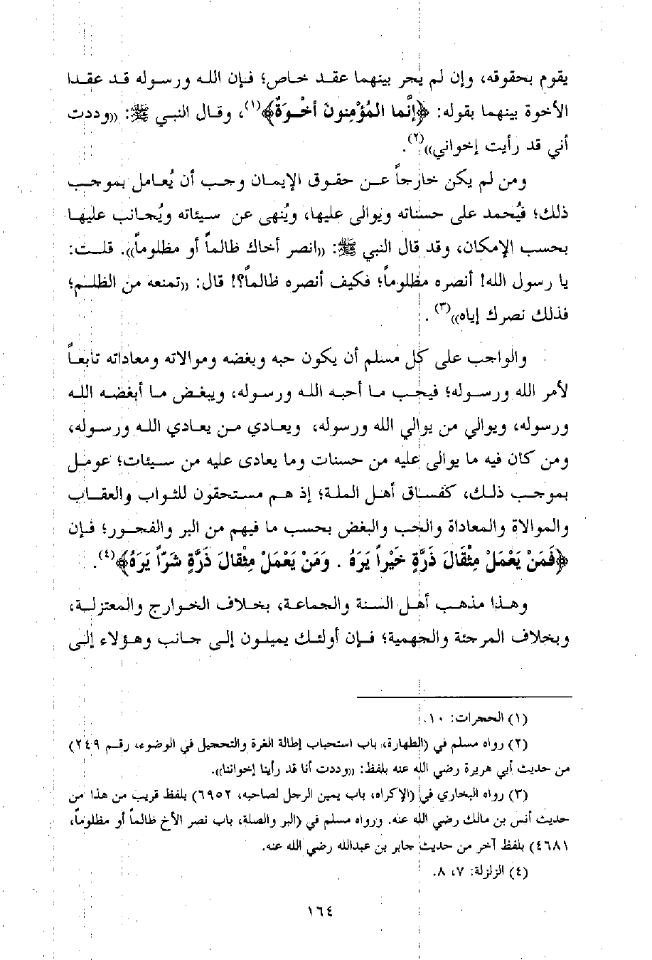 يقوم بحقوقه، وإن لم يجر بينهما عقد خاص؛ فإن الله ورسوله قد عقدا الأخوة بينهما بقوله: {إنَّما المُؤْمِنونَ أخْوَةٌ} (¬1) ، وقال النبي - صلى الله عليه وسلم -: ((وددت أني قد رأيت إخواني)) (¬2) .