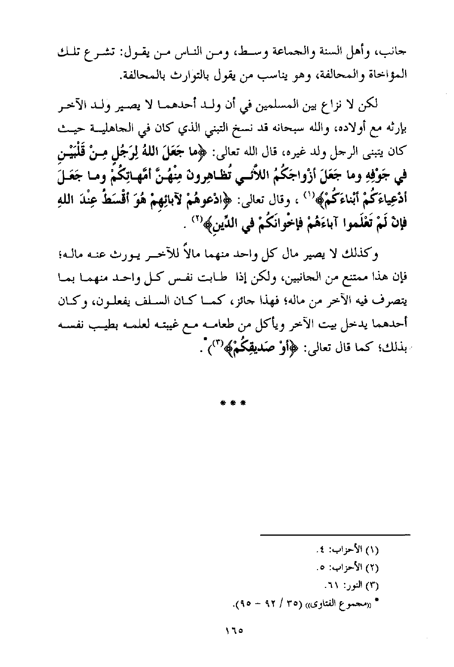لكن لا نزاع بين المسلمين في أن ولد أحدهما لا يصير ولد الآخر بإرثه مع أولاده، والله سبحانه قد نسخ التبني الذي كان في الجاهلية حيث كان يتبنى الرجل ولد غيره، قال الله تعالى: {ما جَعَلَ اللهُ لِرَجُلٍ مِنْ قَلْبَيْنِ في جَوْفِهِ وما جَعَلَ أزْواجَكُمُ اللاَّئي تُظاهِرونَ مِنْهُنَّ أمَّهاتِكُمْ وما جَعَلَ أدْعِياءَكُمْ أبْناءَكُمْ} (¬1) ، وقال تعالى: {ادْعوهُمْ لآبائِهِمْ هُوَ أقْسَطُ عِنْدَ اللهِ فإنْ لَمْ تَعْلَموا آباءَهُمْ فإخْوانَكُمْ في الدِّينِ} (¬2) .