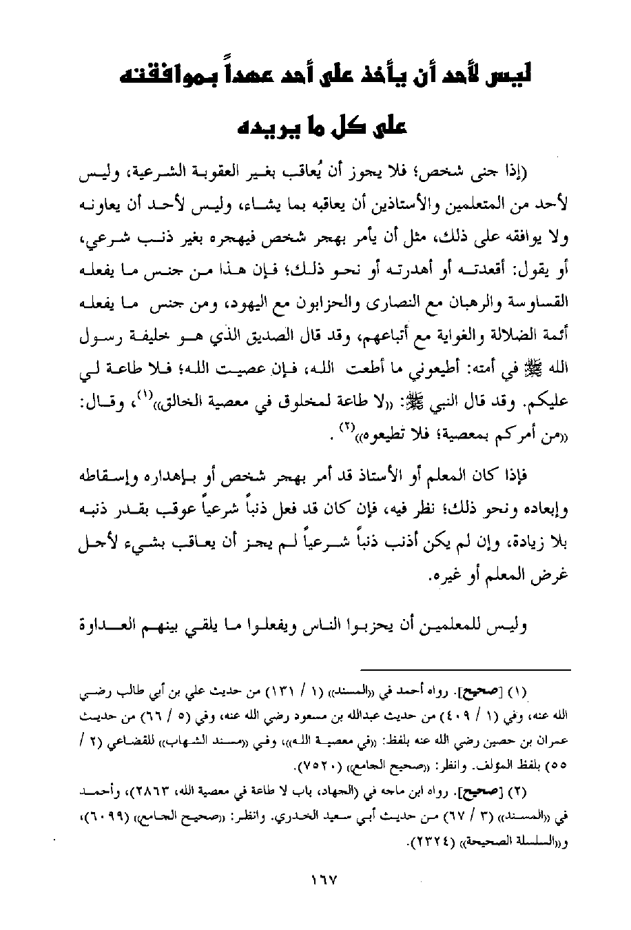 (إذا جنى شخص؛ فلا يجوز أن يُعاقب بغير العقوبة الشرعية، وليس لأحد من المتعلمين والأستاذين أن يعاقبه بما يشاء، وليس لأحد أن يعاونه ولا يوافقه على ذلك، مثل أن يأمر بهجر شخص فيهجره بغير ذنب شرعي، أو يقول: أقعدته أو أهدرته أو نحو ذلك؛ فإن هذا من جنس ما يفعله القساوسة والرهبان مع النصارى والحزابون مع اليهود، ومن جنس ما يفعله أئمة الضلالة والغواية مع أتباعهم، وقد قال الصديق الذي هو خليفة رسول الله - صلى الله عليه وسلم - في أمته: أطيعوني ما أطعت الله، فإن عصيت الله؛ فلا طاعة لي عليكم. وقد قال النبي - صلى الله عليه وسلم -: ((لا طاعة لمخلوق في معصية الخالق)) (¬1) ، وقال: ((من أمركم بمعصية؛ فلا تطيعوه)) (¬2) .