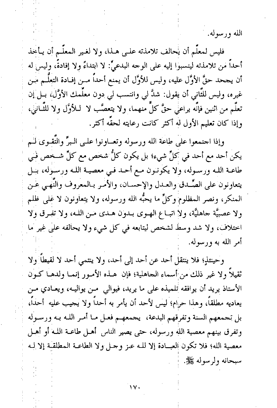 فليس لمعلِّم أن يحالف تلامذته على هذا، ولا لغير المعلِّم أن يأخذ أحداً من تلامذته لينسبوا إليه على الوجه البدعيِّ: لا ابتداءً ولا إفادةً، وليس له أن يجحد حقَّ الأوَّل عليه، وليس للأوَّل أن يمنع أحداً من إفادة التعلُّم من غيره، وليس للثَّاني أن يقول: شدَّ لي وانتسب لي دون معلِّمك الأوَّل، بل إن تعلَّم من اثنين فإنَّه يراعي حقَّ كلٍّ منهما، ولا يتعصَّب لا للأوَّل ولا للثَّاني، وإذا كان تعليم الأول له أكثر كانت رعايته لحقِّه أكثر.
