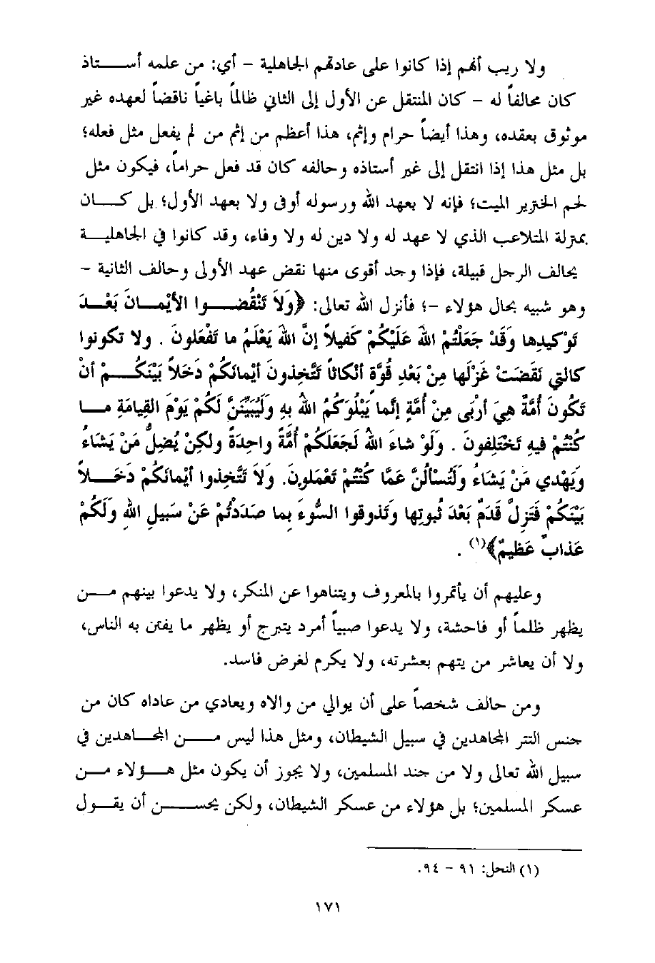 ولا ريب أنهم إذا كانوا على عادتهم الجاهلية - أي: من علمه أستاذ كان محالفاً له - كان المنتقل عن الأول إلى الثاني ظالماً باغياً ناقضاً لعهده غير موثوق بعقده، وهذا أيضاً حرام وإثم، هذا أعظم من إثم من لم يفعل مثل فعله؛ بل مثل هذا إذا انتقل إلى غير أستاذه وحالفه كان قد فعل حراماً، فيكون مثل لحم الخنزير الميت؛ فإنه لا بعهد الله ورسوله أوفى ولا بعهد الأول؛ بل كان بمنزلة المتلاعب الذي لا عهد له ولا دين له ولا وفاء، وقد كانوا في الجاهلية يحالف الرجل قبيلة، فإذا وجد أقوى منها نقض عهد الأولى وحالف الثانية - وهو شبيه بحال هؤلاء -؛ فأنزل الله تعالى: {وَلاَ تَنْقُضوا الأيْمانَ بَعْدَ تَوْكيدِها وَقَدْ جَعَلْتُمْ اللهَ عَلَيْكُمْ كَفيلاً إنَّ اللهَ يَعْلَمُ ما تَفْعَلونَ. ولا تكونوا كالتي نَقَضَتْ غَزْلَها مِنْ بَعْدِ قُوَّةٍ أنْكاثاً تَتَّخِذونَ أيْمانَكُمْ دَخَلاً بَيْنَكُمْ أنْ تَكُونَ أُمَّةٌ هِيَ أرْبَى مِنْ أُمَّةٍ إنَّما يَبْلُوَكُمُ اللهُ بِهِ وَلَيُبَيِّنَنَّ لَكُمْ يَوْمَ القِيامَةِ ما كُنْتُمْ فيهِ تَخْتَلِفونَ. وَلَوْ شاءَ اللهُ لَجَعَلَكُمْ أُمَّةً واحِدَةً ولكِنْ يُضِلُّ مَنْ يَشَاءُ وَيَهْدي مَنْ يَشَاءُ وَلَتُسْألُنَّ عَمَّا كُنْتُمْ تَعْمَلونَ. وَلاَ تَتَّخِذوا أيْمانَكُمْ دَخَلاً بَيْنَكُمْ فَتَزِلَّ قَدَمٌ بَعْدَ ثُبوتِها وَتَذوقوا السُّوءَ بِما صَدَدْتُمْ عَنْ سَبيلِ اللهِ وَلَكُمْ عَذابٌ عَظيمٌ} (¬1) .
