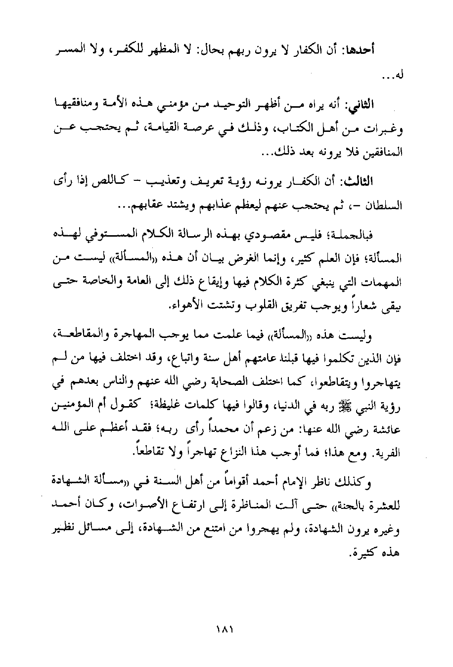 وليست هذه ((المسألة)) فيما علمت مما يوجب المهاجرة والمقاطعة، فإن الذين تكلموا فيها قبلنا عامتهم أهل سنة واتباع، وقد اختلف فيها من لم يتهاجروا ويتقاطعوا، كما اختلف الصحابة رضي الله عنهم والناس بعدهم في رؤية النبي - صلى الله عليه وسلم - ربه في الدنيا، وقالوا فيها كلمات غليظة؛ كقول أم المؤمنين عائشة رضي الله عنها: من زعم أن محمداً رأى ربه؛ فقد أعظم على الله الفرية. ومع هذا؛ فما أوجب هذا النزاع تهاجراً ولا تقاطعاً.
