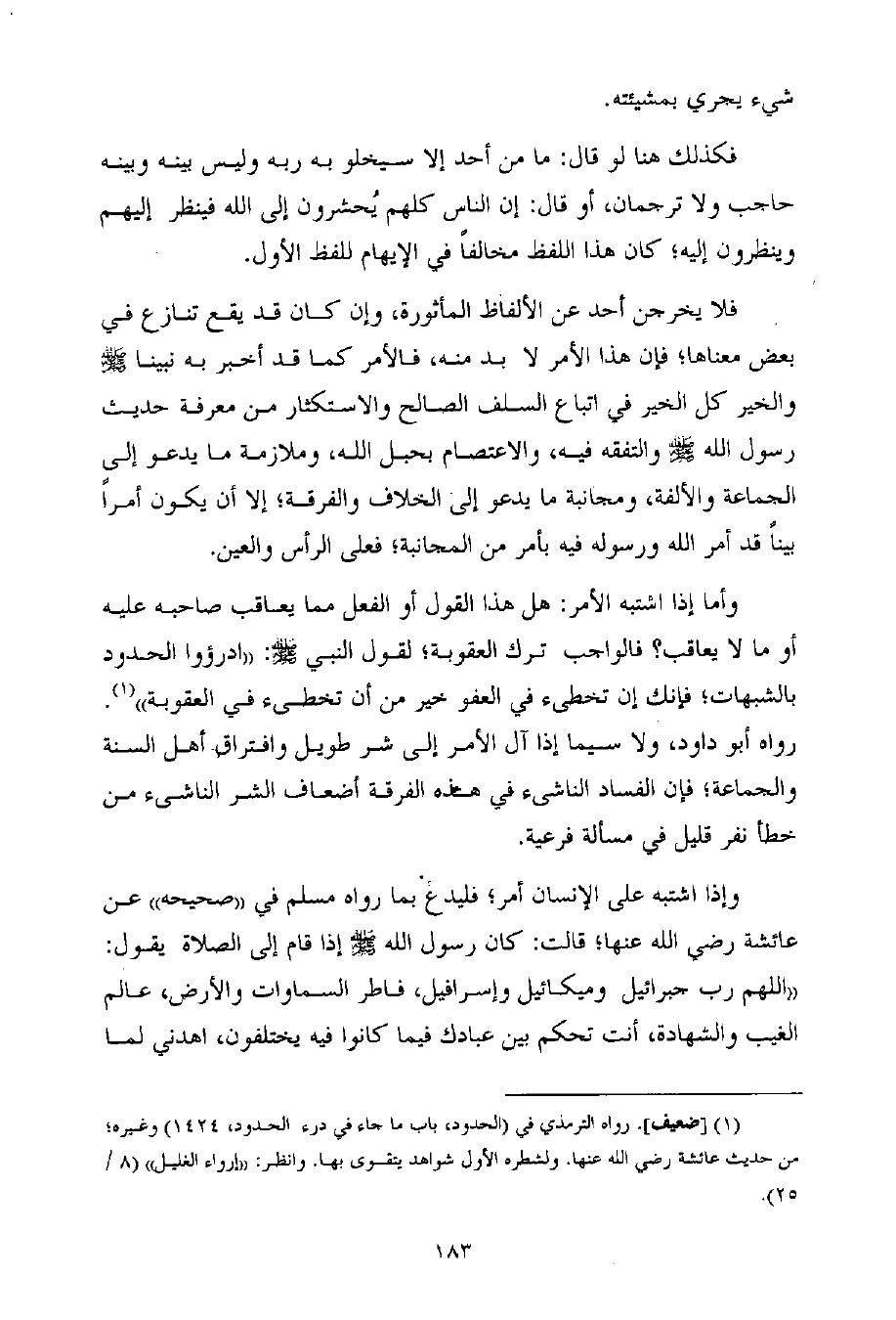 وأما إذا اشتبه الأمر: هل هذا القول أو الفعل مما يعاقب صاحبه عليه أو ما لا يعاقب؟ فالواجب ترك العقوبة؛ لقول النبي - صلى الله عليه وسلم -: ((ادرؤوا الحدود بالشبهات؛ فإنك إن تخطىء في العفو خير من أن تخطىء في العقوبة)) (¬1) . رواه أبو داود، ولا سيما إذا آل الأمر إلى شر طويل وافتراق أهل السنة والجماعة؛ فإن الفساد الناشىء في هذه الفرقة أضعاف الشر الناشىء من خطأ نفر قليل في مسألة فرعية.