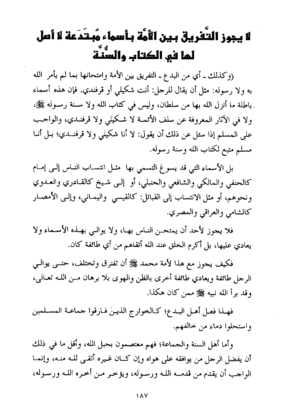 لا يجوز التَّفريق بين الأمَّة بأسماء مُبتَدَعة لا أصل لها في الكتاب والسُّنَّة