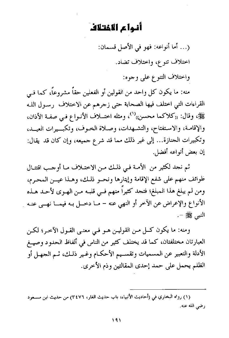 منه: ما يكون كل واحد من القولين أو الفعلين حقاً مشروعاً، كما في القراءات التي اختلف فيها الصحابة حتى زجرهم عن الاختلاف رسول الله - صلى الله عليه وسلم -، وقال: ((كلاكما محسن)) (¬1) ، ومثله اختلاف الأنواع في صفة الأذان، والإقامة، والاستفتاح، والتشهدات، وصلاة الخوف، وتكبيرات العيد، وتكبيرات الجنازة ... إلى غير ذلك مما قد شرع جميعه، وإن كان قد يقال: إن بعض أنواعه أفضل.