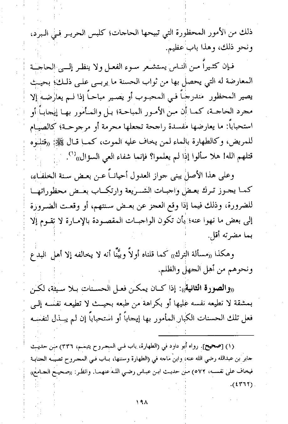 فإن كثيراً من الناس يستشعر سوء الفعل ولا ينظر إلى الحاجة المعارضة له التي يحصل بها من ثواب الحسنة ما يربى على ذلك؛ بحيث يصير المحظور مندرجاً في المحبوب أو يصير مباحاً إذا لم يعارضه إلا مجرد الحاجة، كما أن من الأمور المباحة؛ بل والمأمور بها إيجاباً أو استحباباً: ما يعارضها مفسدة راجحة تجعلها محرمة أو مرجوحة؛ كالصيام للمريض، وكالطهارة بالماء لمن يخاف عليه الموت، كما قال - صلى الله عليه وسلم -: ((قتلوه قتلهم الله! هلا سألوا إذا لم يعلموا؟ فإنما شفاء العي السؤال)) (¬1) .