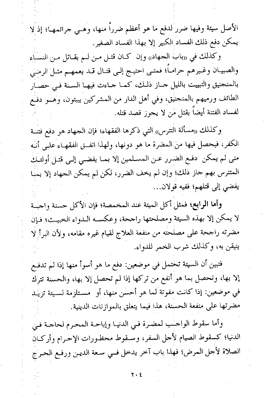 وكذلك ((مسألة التترس)) التي ذكرها الفقهاء؛ فإن الجهاد هو دفع فتنة الكفر، فيحصل فيها من المضرة ما هو دونها، ولهذا اتفق الفقهاء على أنه متى لم يمكن دفع الضرر عن المسلمين إلا بما يفضي إلى قتل أولئك المتترس بهم جاز ذلك؛ وإن لم يخف الضرر، لكن لم يمكن الجهاد إلا بما يفضي إلى قتلهم؛ ففيه قولان ...