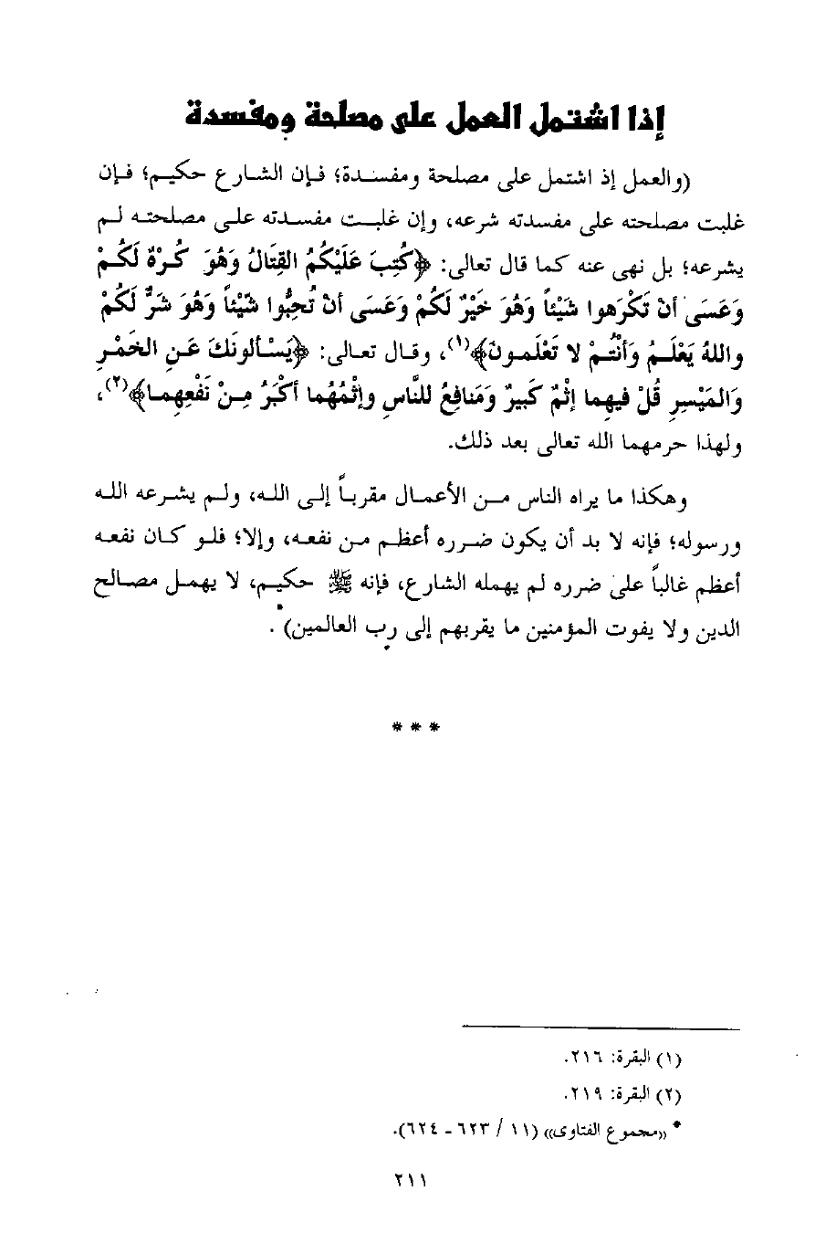 (والعمل إذ اشتمل على مصلحة ومفسدة؛ فإن الشارع حكيم؛ فإن غلبت مصلحته على مفسدته شرعه، وإن غلبت مفسدته على مصلحته لم يشرعه؛ بل نهى عنه كما قال تعالى: {كُتِبَ عَلَيْكُمُ القِتَالُ وَهُوَ كُرْهٌ لَكُمْ وَعَسَى أنْ تَكْرَهوا شَيْئاً وَهُوَ خَيْرٌ لَكُمْ وَعَسَى أنْ تُحِبُّوا شّيْئاً وَهُوَ شَرٌّ لَكُمْ واللهُ يَعْلَمُ وَأنْتُمْ لا تَعْلَمونَ} (¬1) ، وقال تعالى: {يَسْألونَكَ عَنِ الخَمْرِ وَالمَيْسِرِ قُلْ فيهِما إثْمٌ كَبيرٌ وَمَنافِعُ للنَّاسِ وإثْمُهُما أكْبَرُ مِنْ نَفْعِهِما} (¬2) ، ولهذا حرمهما الله تعالى بعد ذلك.