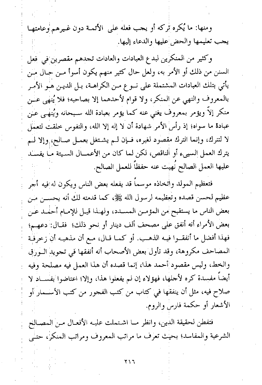 وكثير من المنكرين لبدع العبادات والعادات تجدهم مقصرين في فعل السنن من ذلك أو الأمر به، ولعل حال كثير منهم يكون أسوأ من حال من يأتي بتلك العبادات المشتملة على نوع من الكراهة، بل الدين هو الأمر بالمعروف والنهي عن المنكر، ولا قوام لأحدهما إلا بصاحبه؛ فلا يُنهى عن منكر إلاّ ويؤمر بمعروف يغني عنه كما يؤمر بعبادة الله سبحانه ويُنهى عن عبادة ما سواه؛ إذ رأس الأمر شهادة أن لا إله إلا الله، والنفوس خلقت لتعمل لا لتترك، وإنما الترك مقصود لغيره، فإن لم يشتغل بعمل صالح، وإلا لم يترك العمل السيىء أو الناقص، لكن لما كان من الأعمال السيئة ما يفسد عليها العمل الصالح نُهيت عنه حفظاً للعمل الصالح.