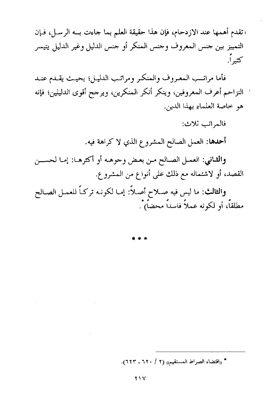 والثالث: ما ليس فيه صلاح أصلاً: إما لكونه تركاً للعمل الصالح مطلقاً، أو لكونه عملاً فاسداً محضاً) (¬1) .