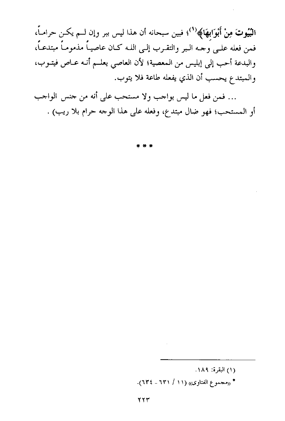 البُيُوتَ مِنْ أَبْوَابِهَا} (¬1) ؛ فبين سبحانه أن هذا ليس ببر وإن لم يكن حراماً، فمن فعله على وجه البر والتقرب إلى الله كان عاصياً مذموماً مبتدعاً، والبدعة أحب إلى إبليس من المعصية؛ لأن العاصي يعلم أنه عاص فيتوب، والمبتدع يحسب أن الذي يفعله طاعة فلا يتوب.