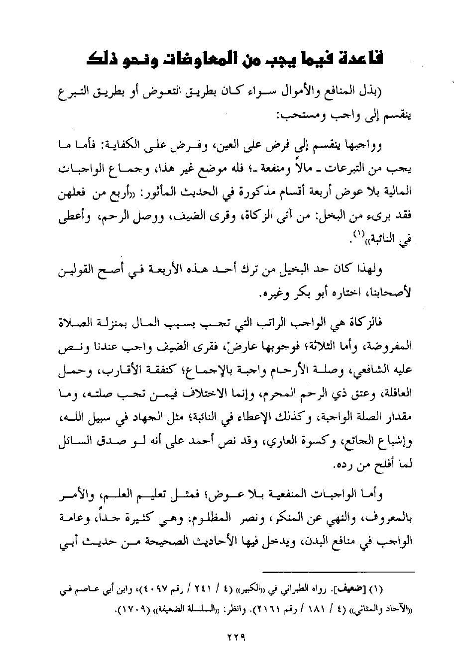 وواجبها ينقسم إلى فرض على العين، وفرض على الكفاية: فأما ما يجب من التبرعات ـ مالاً ومنفعة ـ؛ فله موضع غير هذا، وجماع الواجبات المالية بلا عوض أربعة أقسام مذكورة في الحديث المأثور: ((أربع من فعلهن فقد برىء من البخل: من آتى الزكاة، وقرى الضيف، ووصل الرحم، وأعطى في النائبة)) (¬1) .