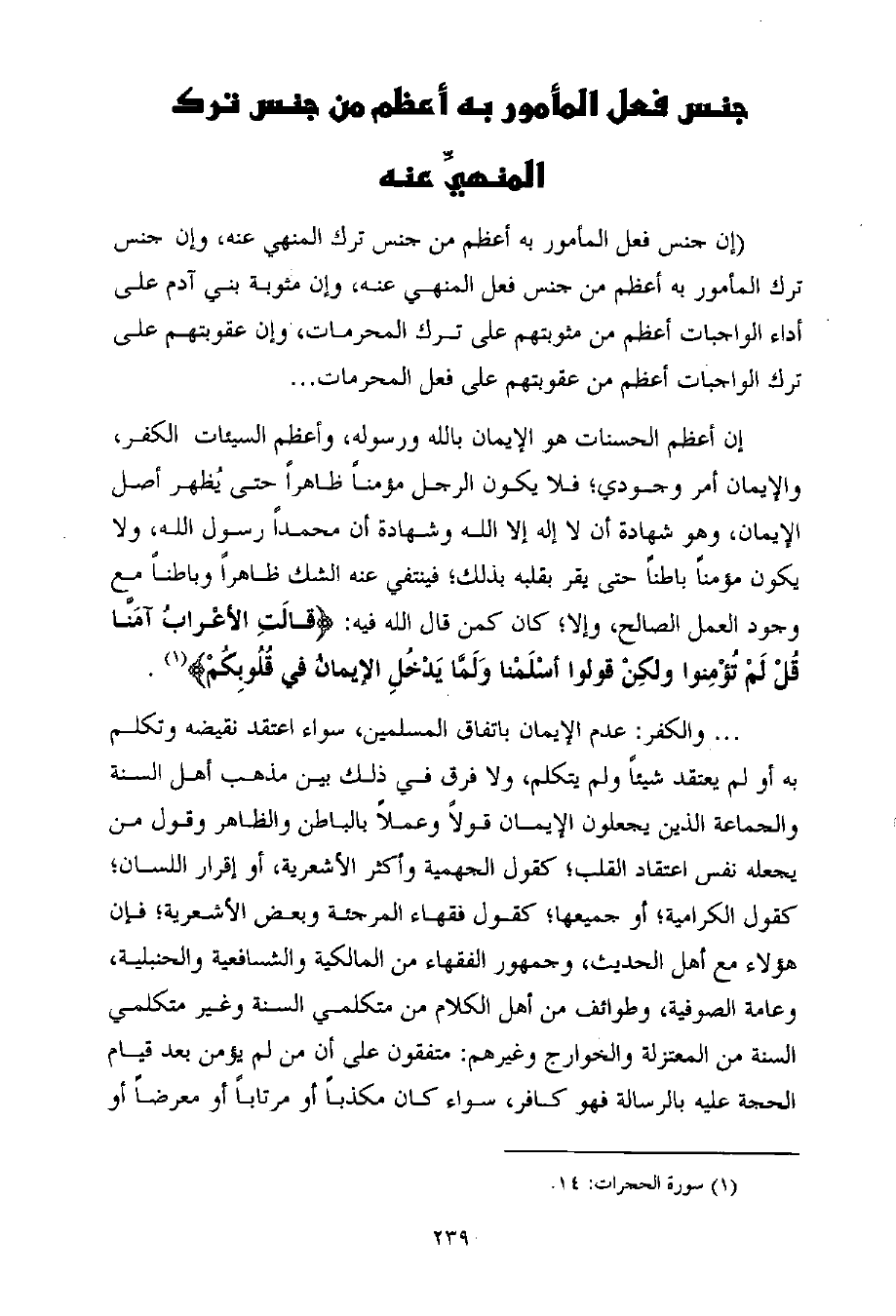 إن أعظم الحسنات هو الإيمان بالله ورسوله، وأعظم السيئات الكفر، والإيمان أمر وجودي؛ فلا يكون الرجل مؤمناً ظاهراً حتى يُظهر أصل الإيمان، وهو شهادة أن لا إله إلا الله وشهادة أن محمداً رسول الله، ولا يكون مؤمناً باطناً حتى يقر بقلبه بذلك؛ فينتفي عنه الشك ظاهراً وباطناً مع وجود العمل الصالح، وإلا؛ كان كمن قال الله فيه: {قالَتِ الأعْرابُ آمَنَّا قُلْ لَمْ تُؤْمِنوا ولكِنْ قولوا أسْلَمْنا وَلَمَّا يَدْخُلِ الإيمانُ في قُلُوبِكُمْ} (¬1) .
