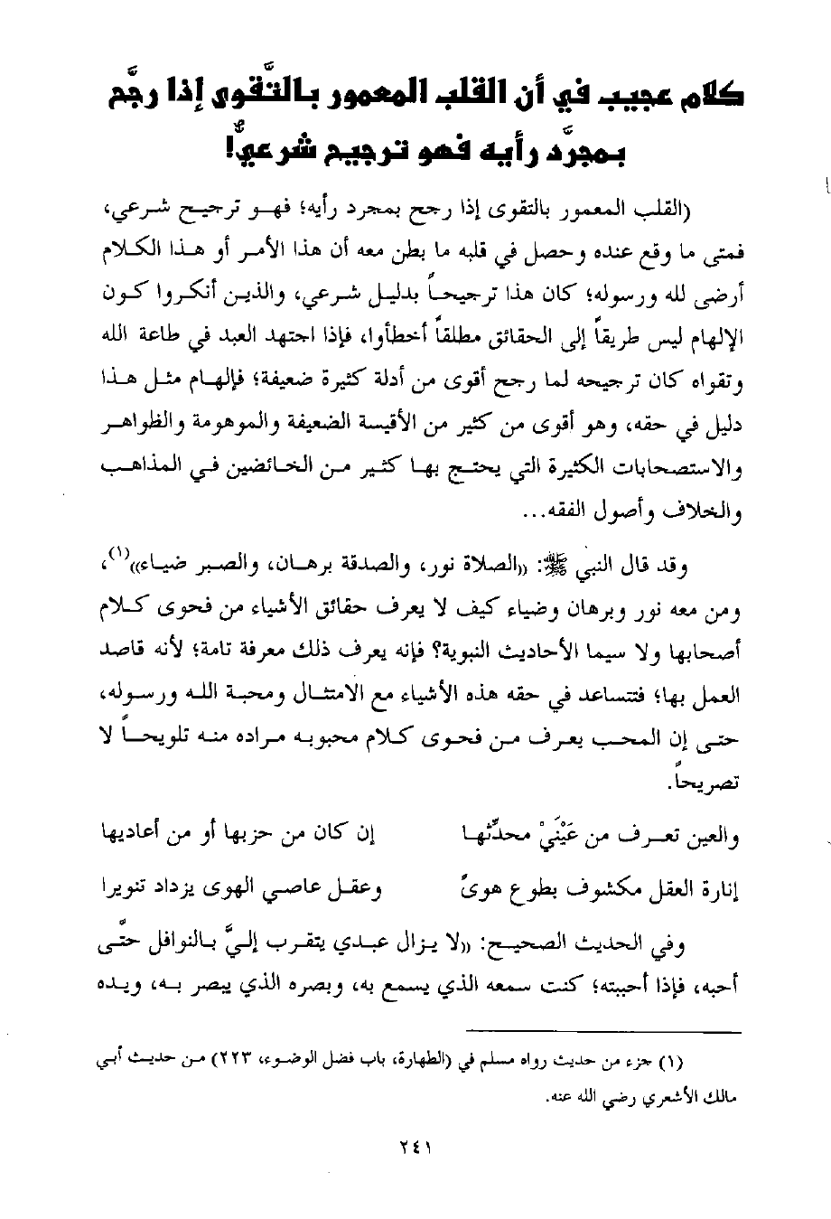 (القلب المعمور بالتقوى إذا رجح بمجرد رأيه؛ فهو ترجيح شرعي، فمتى ما وقع عنده وحصل في قلبه ما بطن معه أن هذا الأمر أو هذا الكلام أرضى لله ورسوله؛ كان هذا ترجيحاً بدليل شرعي، والذين أنكروا كون الإلهام ليس طريقاً إلى الحقائق مطلقاً أخطأوا، فإذا اجتهد العبد في طاعة الله وتقواه كان ترجيحه لما رجح أقوى من أدلة كثيرة ضعيفة؛ فإلهام مثل هذا دليل في حقه، وهو أقوى من كثير من الأقيسة الضعيفة والموهومة والظواهر والاستصحابات الكثيرة التي يحتج بها كثير من الخائضين في المذاهب والخلاف وأصول الفقه ...
