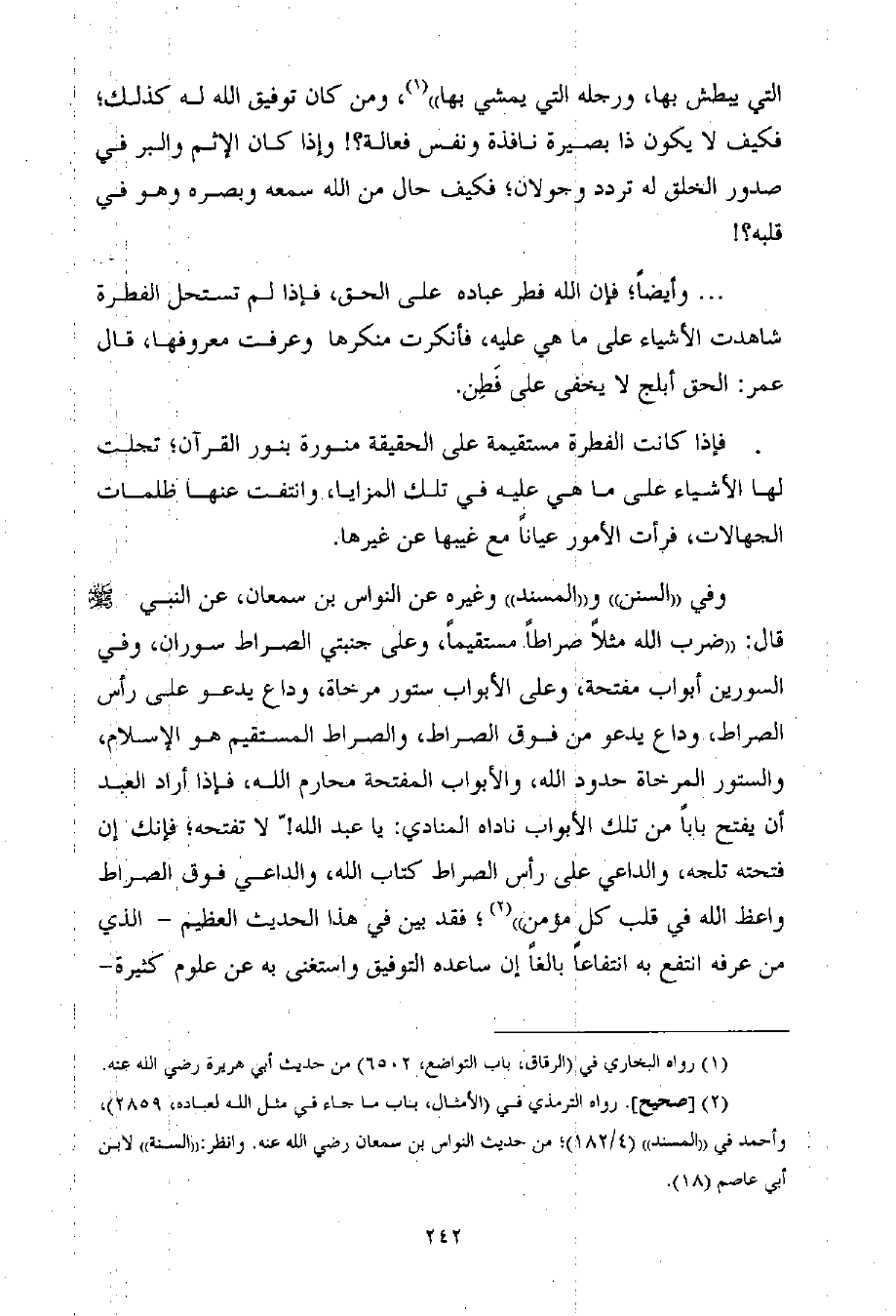 وفي ((السنن)) و ((المسند)) وغيره عن النواس بن سمعان، عن النبي - صلى الله عليه وسلم - قال: ((ضرب الله مثلاً صراطاً مستقيماً، وعلى جنبتي الصراط سوران، وفي السورين أبواب مفتحة، وعلى الأبواب ستور مرخاة، وداع يدعو على رأس الصراط، وداع يدعو من فوق الصراط، والصراط المستقيم هو الإسلام، والستور المرخاة حدود الله، والأبواب المفتحة محارم الله، فإذا أراد العبد أن يفتح باباً من تلك الأبواب ناداه المنادي: يا عبد الله! ّ لا تفتحه؛ فإنك إن فتحته تلجه، والداعي على رأس الصراط كتاب الله، والداعي فوق الصراط واعظ الله في قلب كل مؤمن)) (¬2) ؛ فقد بين في هذا الحديث العظيم - الذي من عرفه انتفع به انتفاعاً بالغاً إن ساعده التوفيق واستغنى به عن علوم كثيرة-