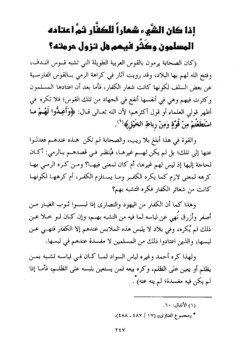 إذا كان الشَّيء شعاراً للكفَّار ثمَّ اعتاده المسلمون وكَثُر فيهم هل تزول حرمته؟