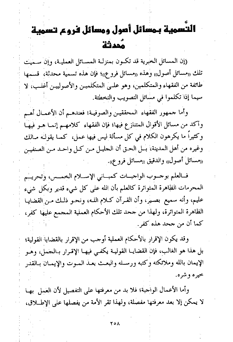 (إن المسائل الخبرية قد تكون بمنزلة المسائل العملية، وإن سميت تلك ((مسائل أصول)) وهذه ((مسائل فروع)) ؛ فإن هذه تسمية محدثة، قسمها طائفة من الفقهاء والمتكلمين، وهو على المتكلمين والأصوليين أغلب، لا سيما إذا تكلموا في مسائل التصويب والتخطئة.