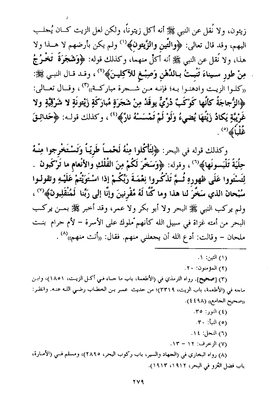 وكذلك قوله في البحر: {لِتَأْكُلوا مِنْهُ لَحْماً طَرِيّاً وَتَسْتَخْرِجوا مِنْهُ حِلُيَةً تَلْبَسونَها} (¬6) ، وقوله: {وَسَخَّرَ لَكُمْ مِنَ الفُلْكِ والأنْعامِ ما تَرْكَبونَ. لِتَسْتَووا عَلَى ظهورِهِ ثُمَّ تَذْكُروا نِعْمَةَ رَبِّكُمْ إذا اسْتَوَيْتُمْ عَلَيْهِ وتقولوا سُبْحانَ الذي سَخَّرَ لنا هذا وما كُنَّا لَهُ مُقْرِنينَ وإنَّا إلى رَبِّنا لَمُنْقَلِبونَ} (¬7) ، ولم يركب النبي - صلى الله عليه وسلم - البحر ولا أبو بكر ولا عمر، وقد أخبر - صلى الله عليه وسلم - بمن يركب البحر من أمته غزاة في سبيل الله كأنهم ملوك على الأسرة - لأم حرام بنت ملحان - وقالت: أدع الله أن يجعلني منهم. فقال: ((أنت منهم)) (¬8) .